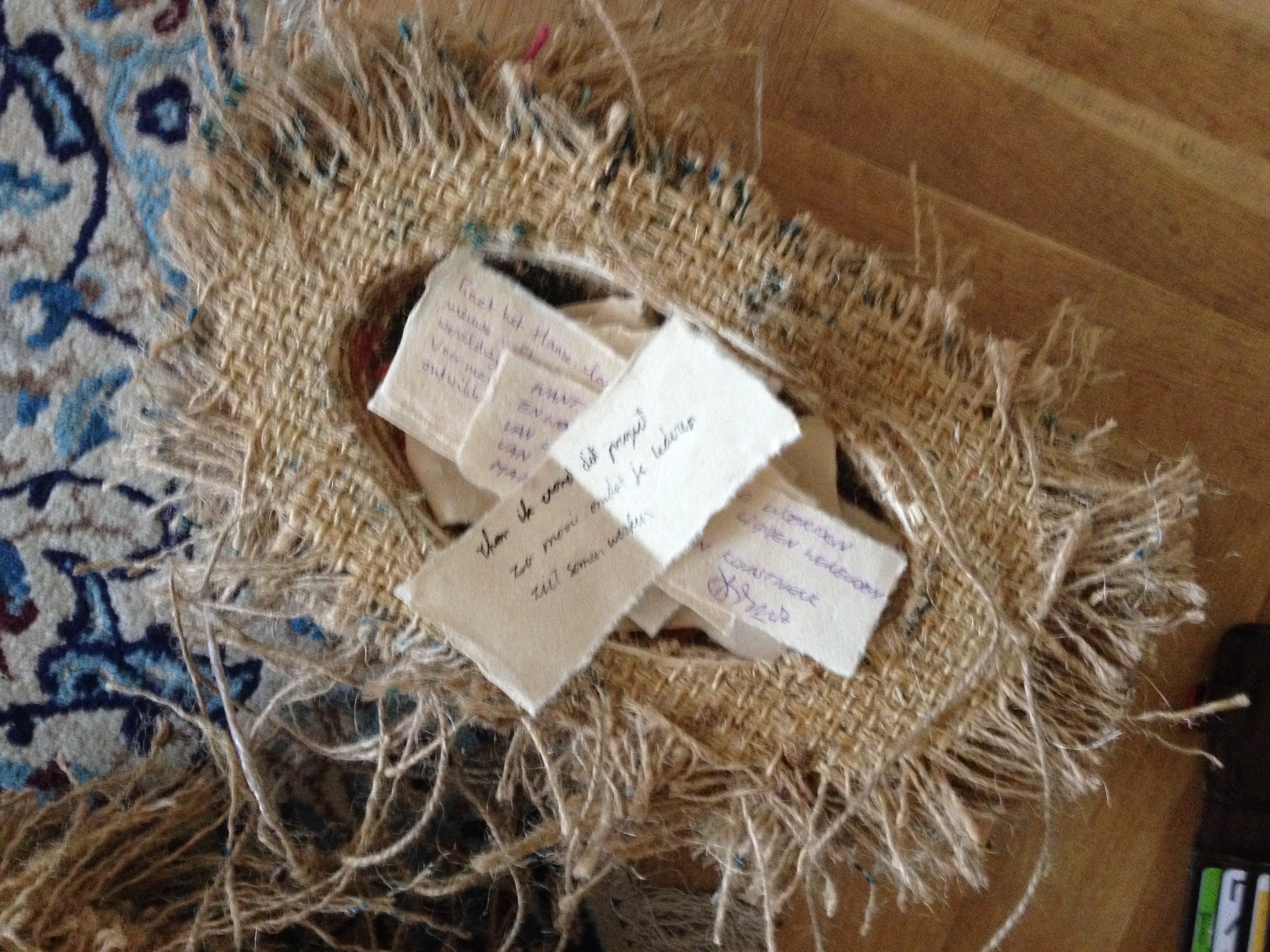 A bean made of wood and jute, with all the personal wishes of our volunteers in it.