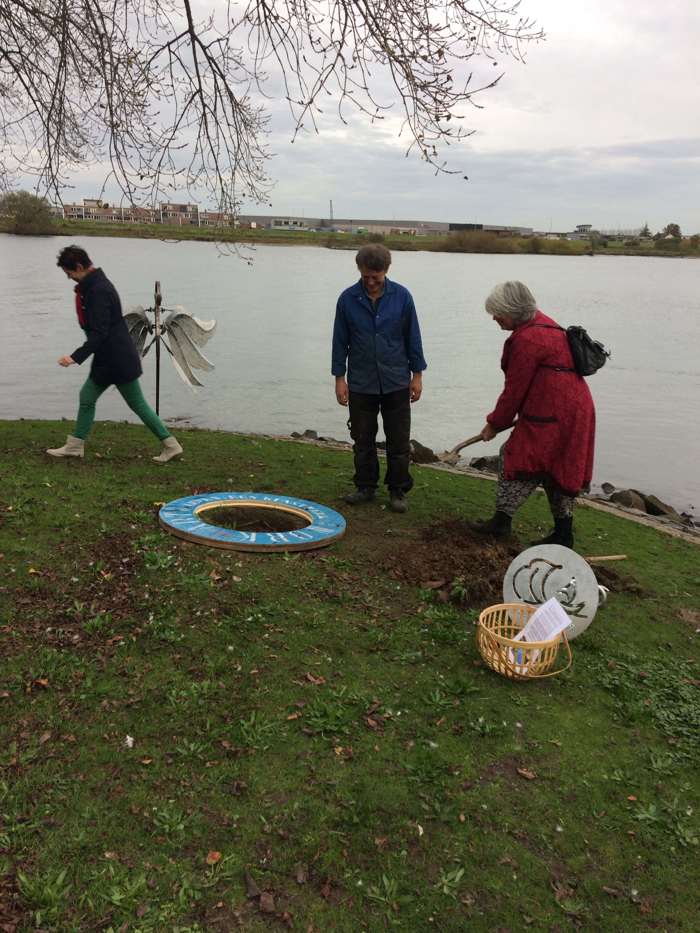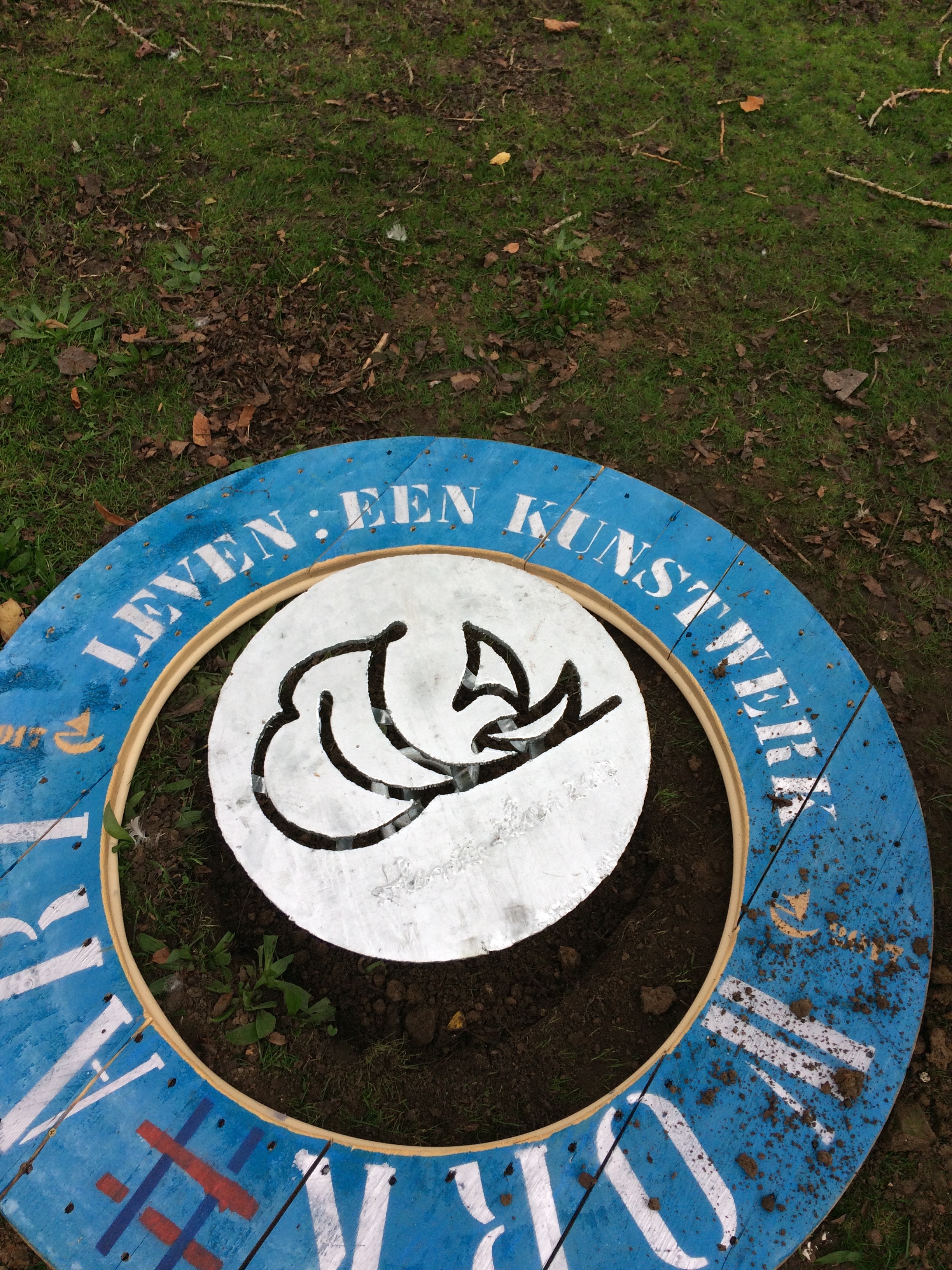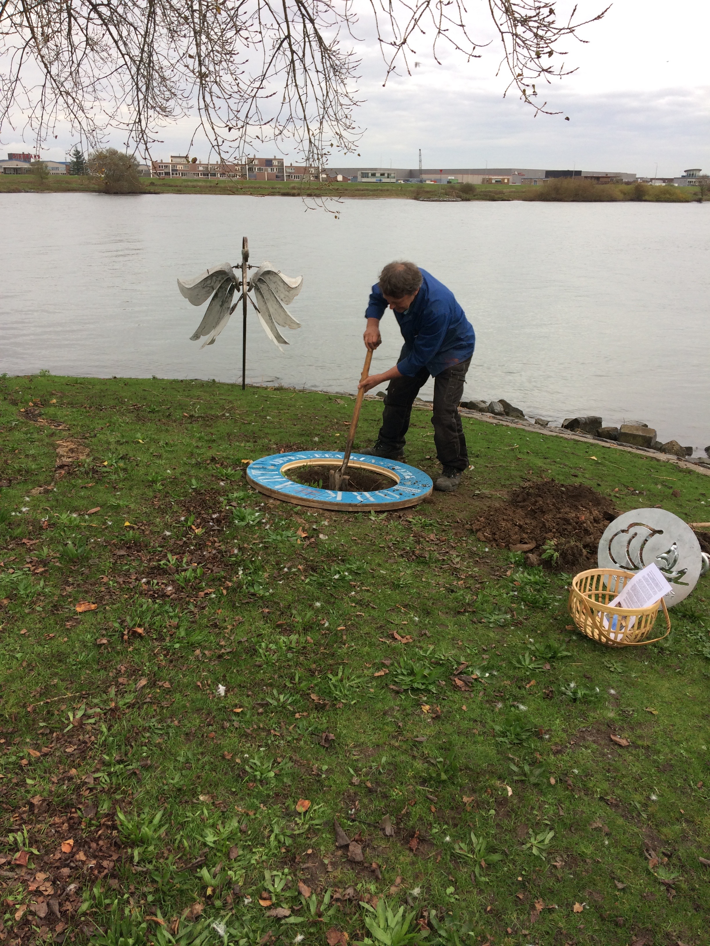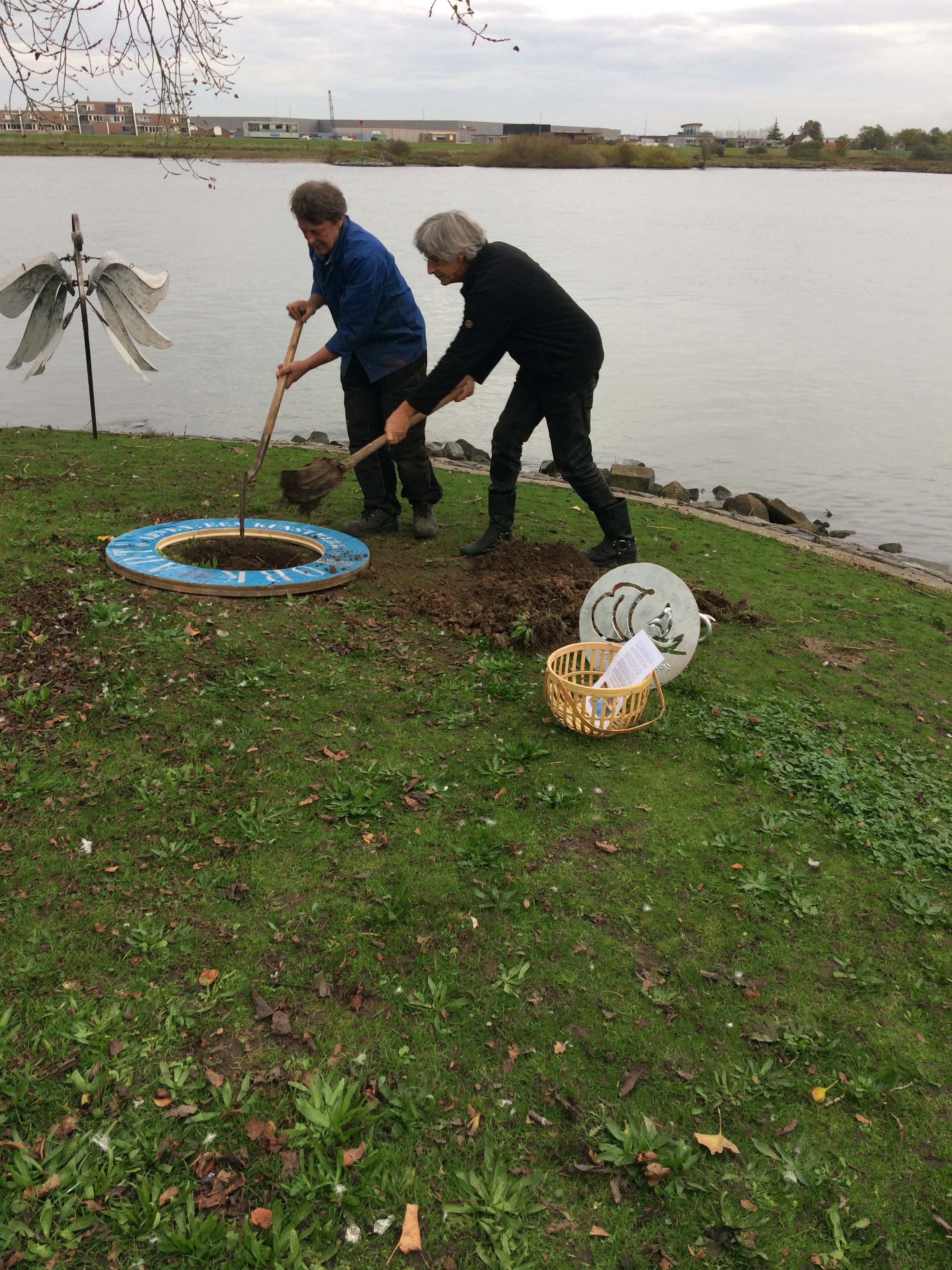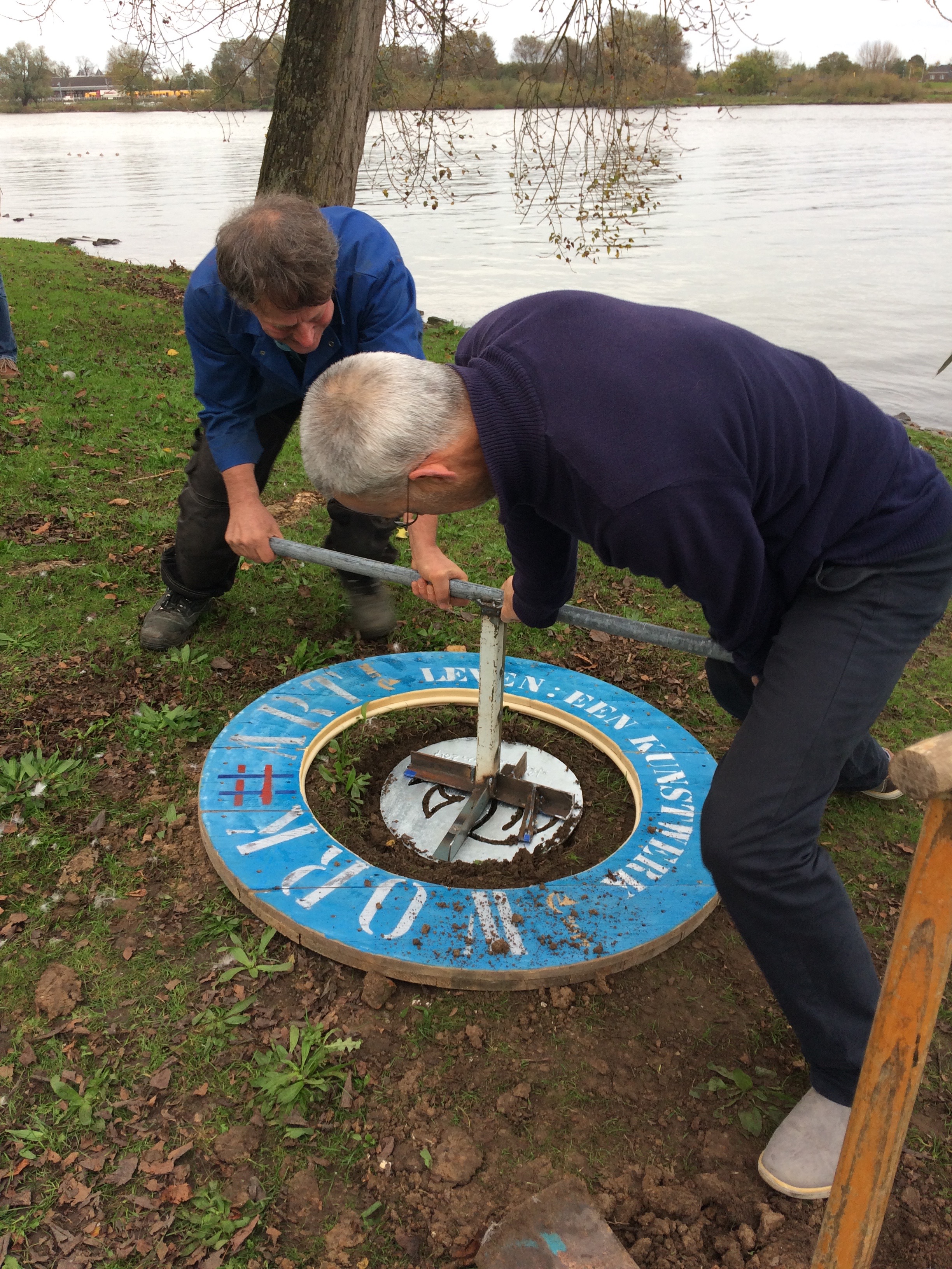 Bert drilled a deep narrow hole with a drill bit. The seed is buried at more than one arm’s length in the Oorgat Park; who wanted to throw a bunch of sand on it. Then the plaque, fitted with a kind of corkscrew, was turned into the ground. Just below the ground level (^ .. ^). There it’s is a reminder of the Hanze elan 2017 and the ‘Little Ship on Wooden Waves’.