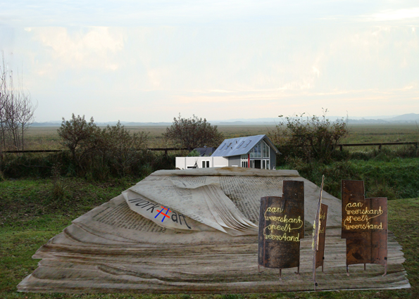 So working and converting these issues, we came out on ‘Palimpsest’, the titel of our installation. That is: peeling, distinguishing, rearrange and rewrite the stratifications we come across. Within the themes, the landscape and in our working process. Out of this savage and empty soil on the new spot, our art rises literally out of the ground and into the air. In fact, how blank is this savageness and emptiness after all? How frank does art work?  Every moment is to be taken as ‘in a beginning’ of a future. Every spot offers a beginning like that: here, now and what comes up to you from the horizon. Playing with time and space like this, a expectant and fanciful vision arises. A future that, in the eyes of many people, is at stake. You can ask yourself: what is at stake after all? ‘Skimming light’. Everything present on the spot offers you an other sight, if you look at it this way. The spirit that is about and the images that come up out of that, raise a ‘dust’. ‘Dust’ to reflection.