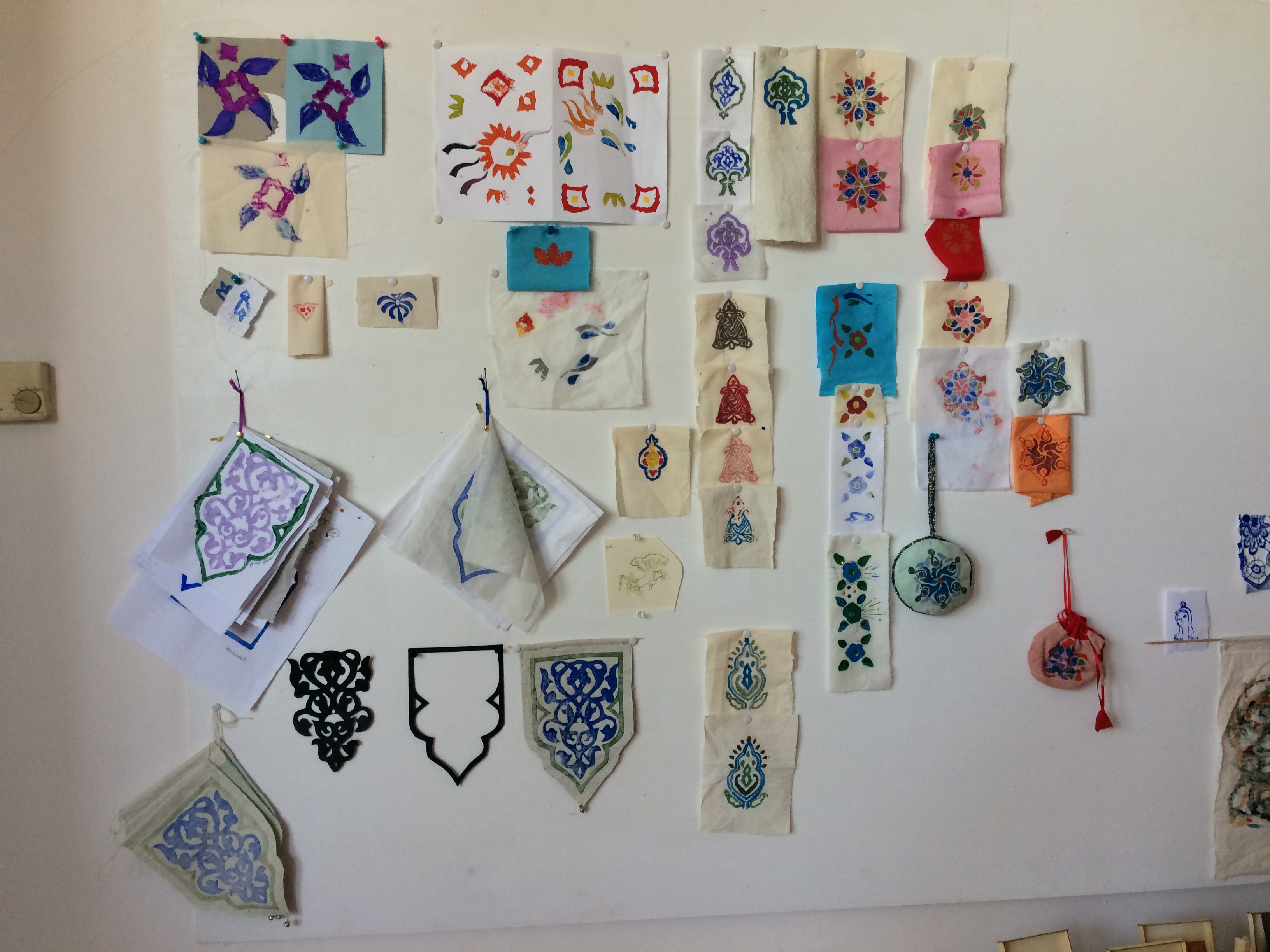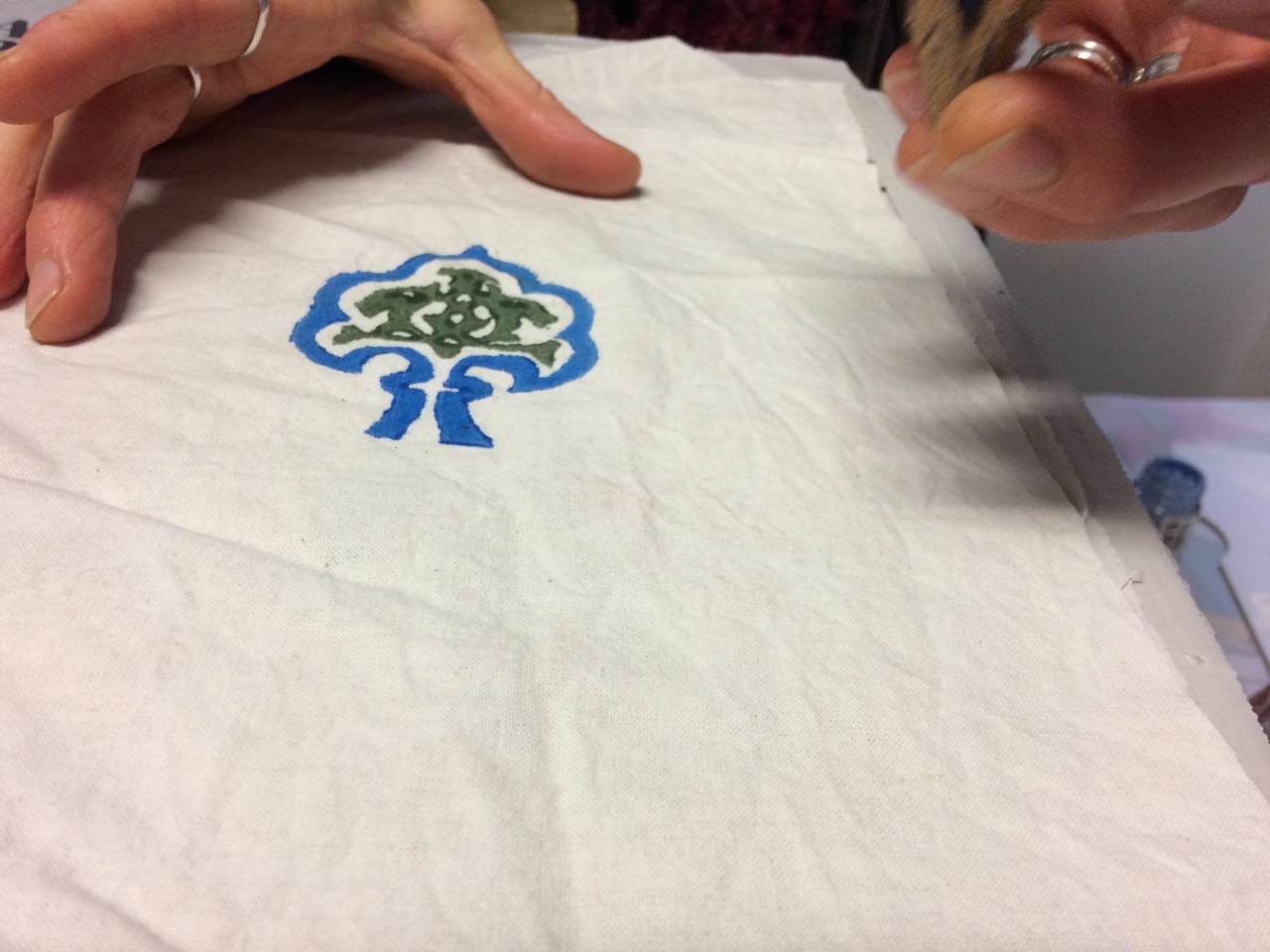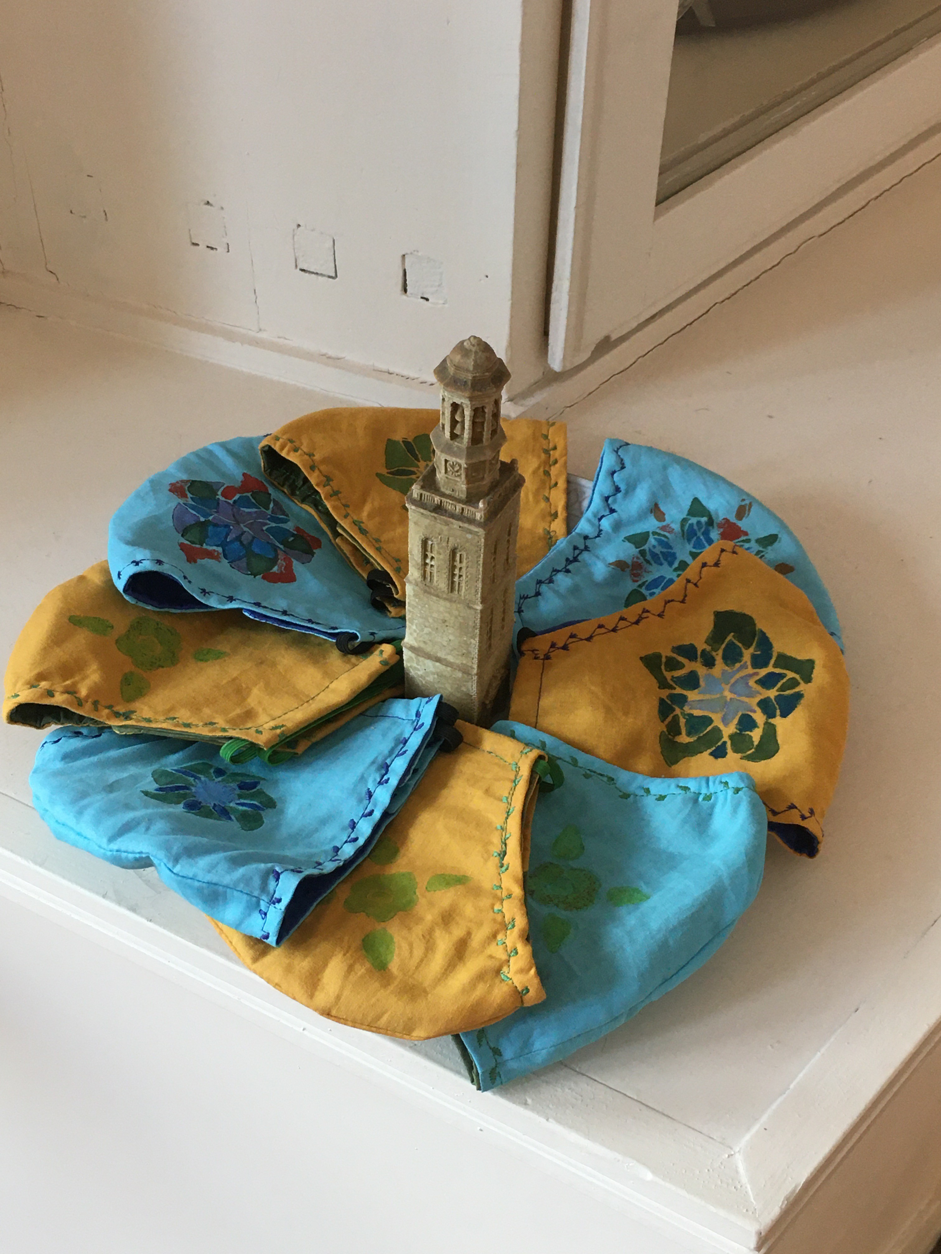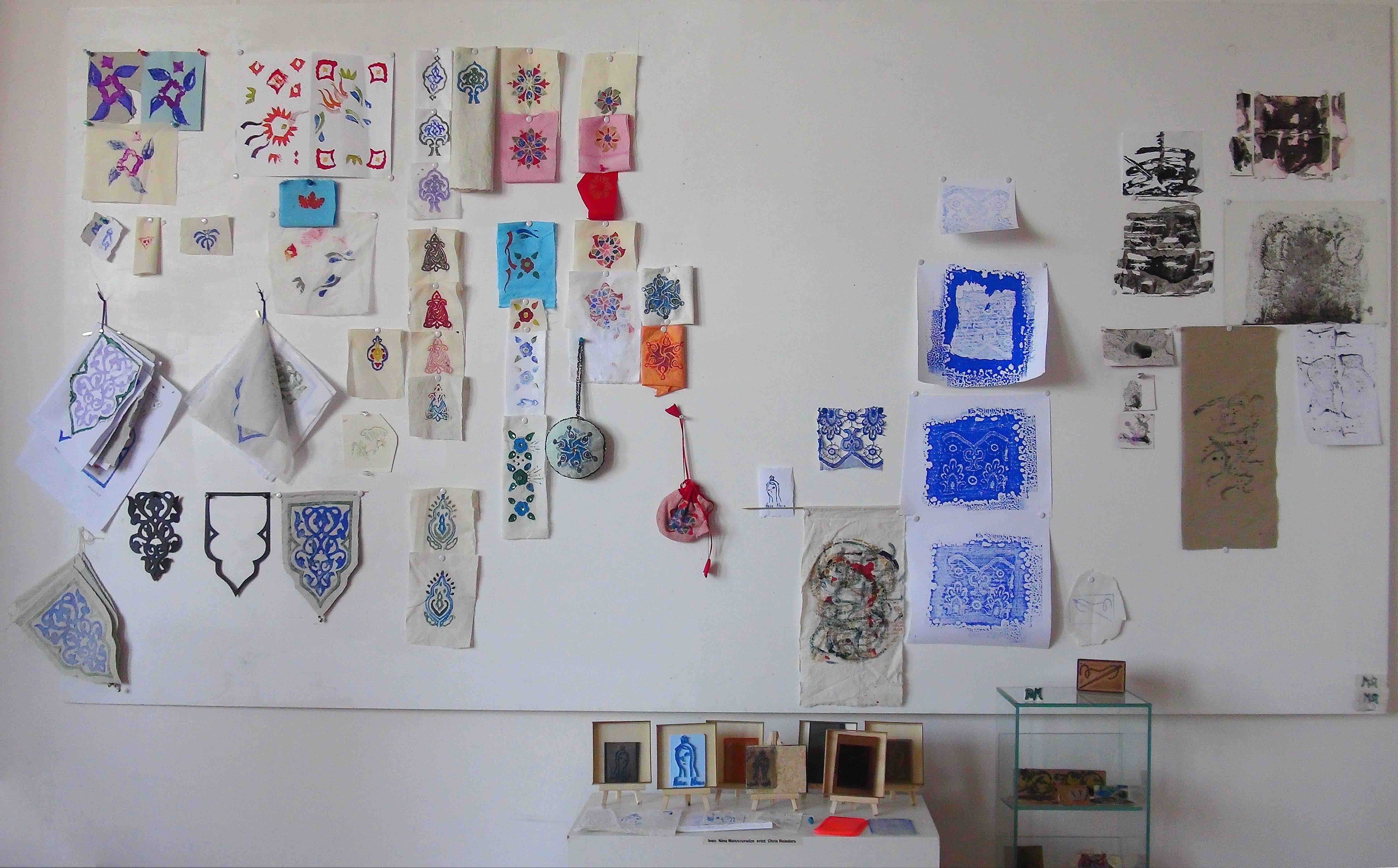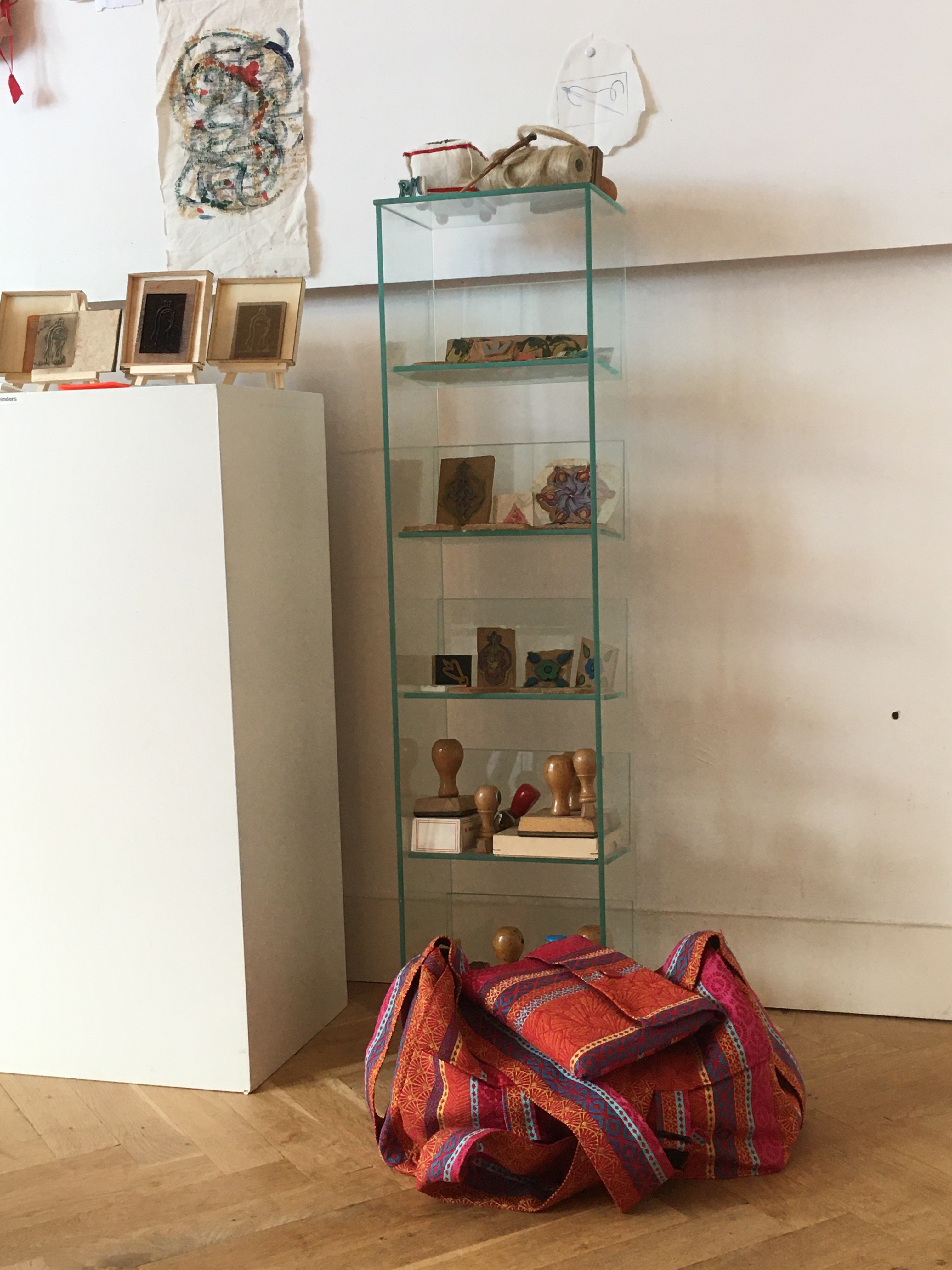 Manon en Rietje wilden iets nieuws uitproberen dat toch raakt aan beider ‘normale’ werkwijzen. Zo’n 4 maanden geleden begonnen ze te broeden op dat wat hen beiden inspireerde. Het enige plannetje was om ontwerpen van Manon op textiel te drukken waar Rietje dan een vorm aan zou geven. Wat uiteindelijk gebeurde was dat ze samen uitvonden hoe dat drukproces zich al doende eigen te maken. Ze zochten uit welke inkt, verf, papier en stof combinaties het meest geschikt waren en lieten op die manier zich steeds weer verrassen. Ze hebben gestempeld en de stempels onder de drukpers doorgehaald.