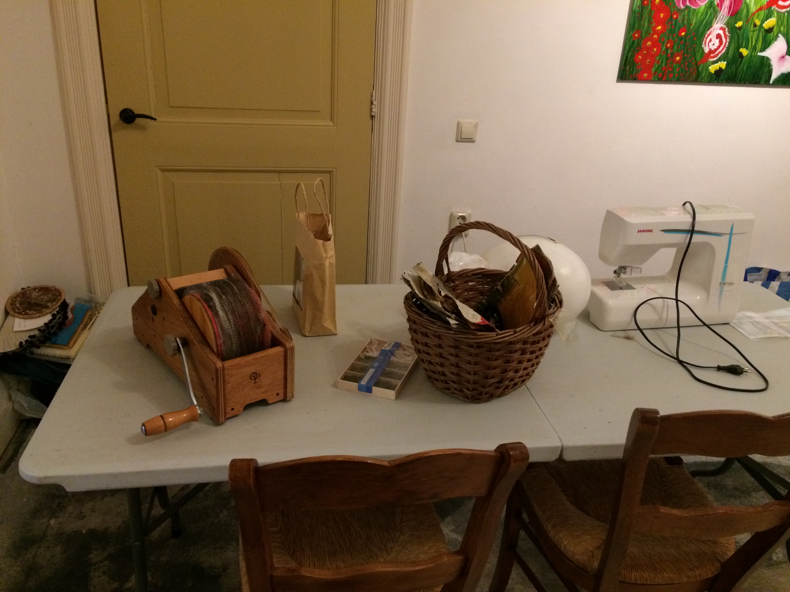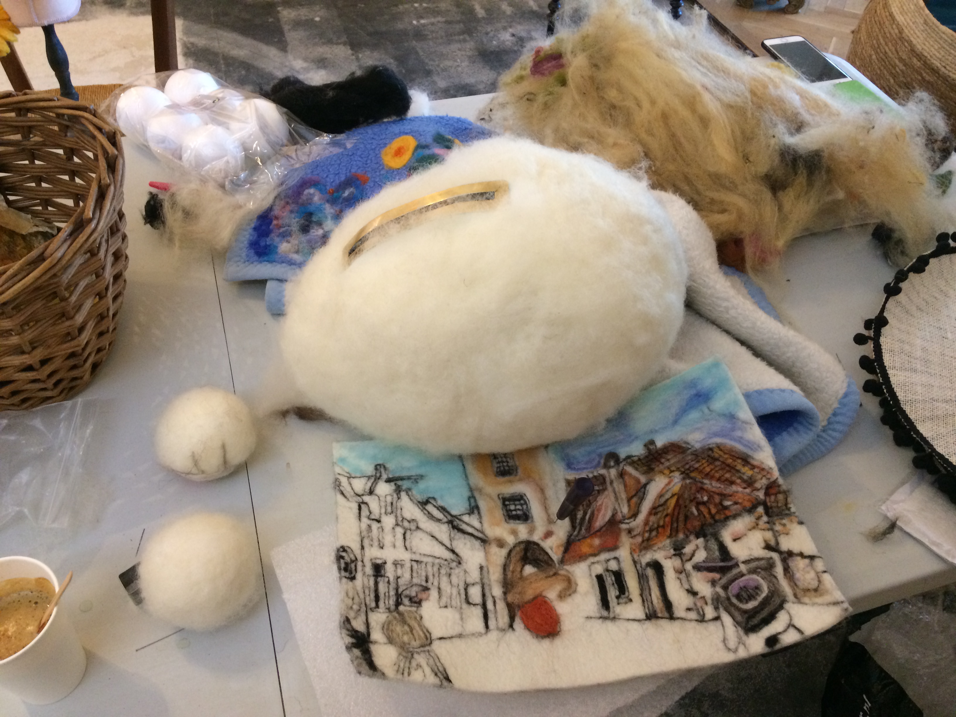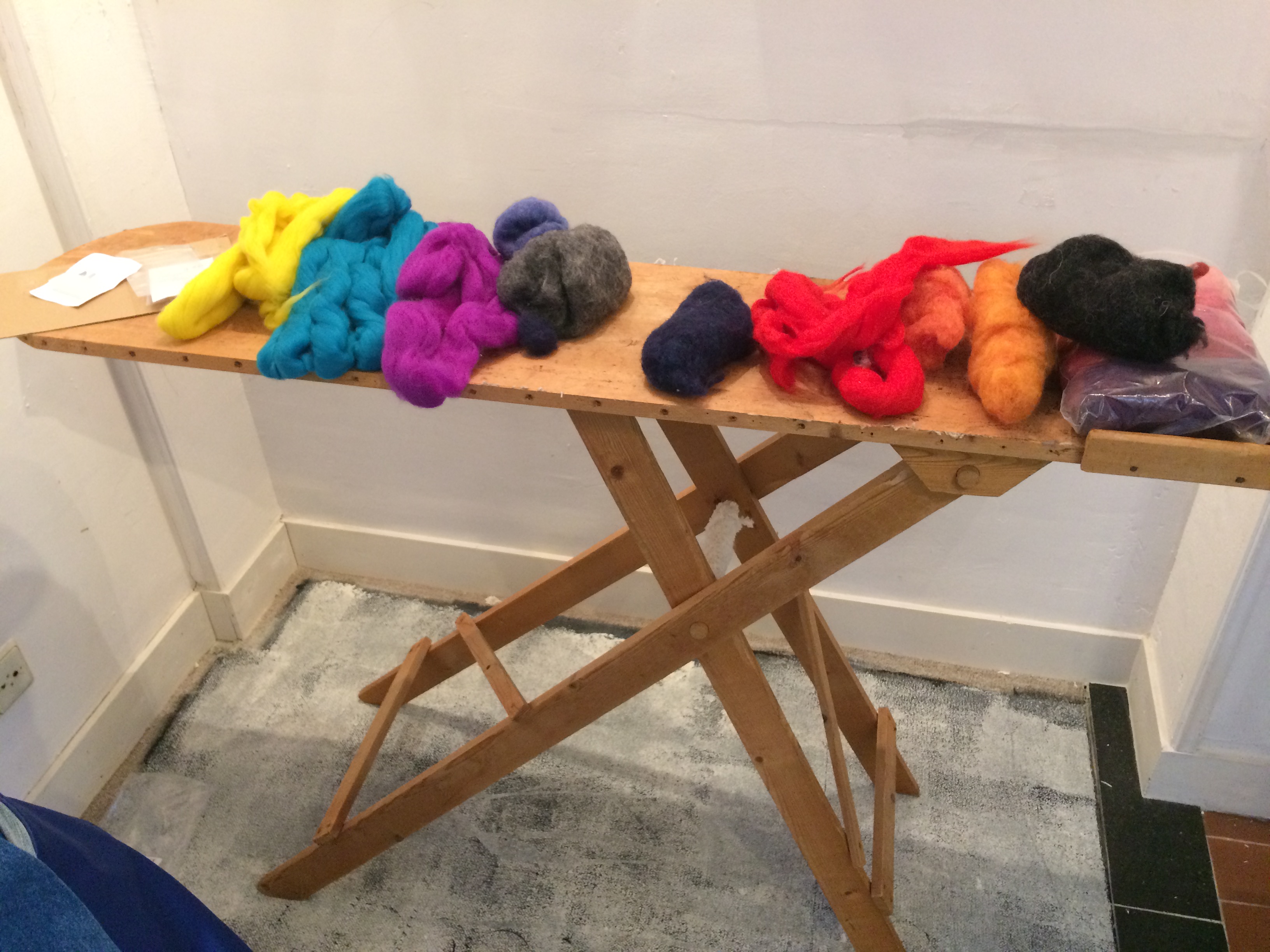 Op de werktafel staan allerlei geheimzinnige apparaten en mandjes te wachten; een machine om de wol te kaarden, een apparaat om machinaal de naaldvilt methode te hanteren en daarnaast tal van wolstrengetjes om verwerkt te worden. En prikpennen natuurlijk om al pratend met elkaar en het publiek een stukje naaldvilt te laten ontstaan. Het ei, symbool voor de minibroedplaats en spaarpot om dit project financieel te kunnen bijstaan, ontkomt ook niet aan behandeling. Het krijgt een warm wollen jasje en stippen als op een vogelei.