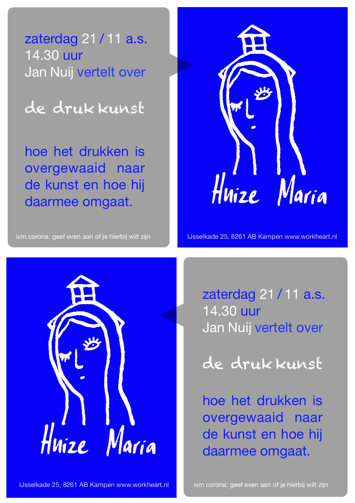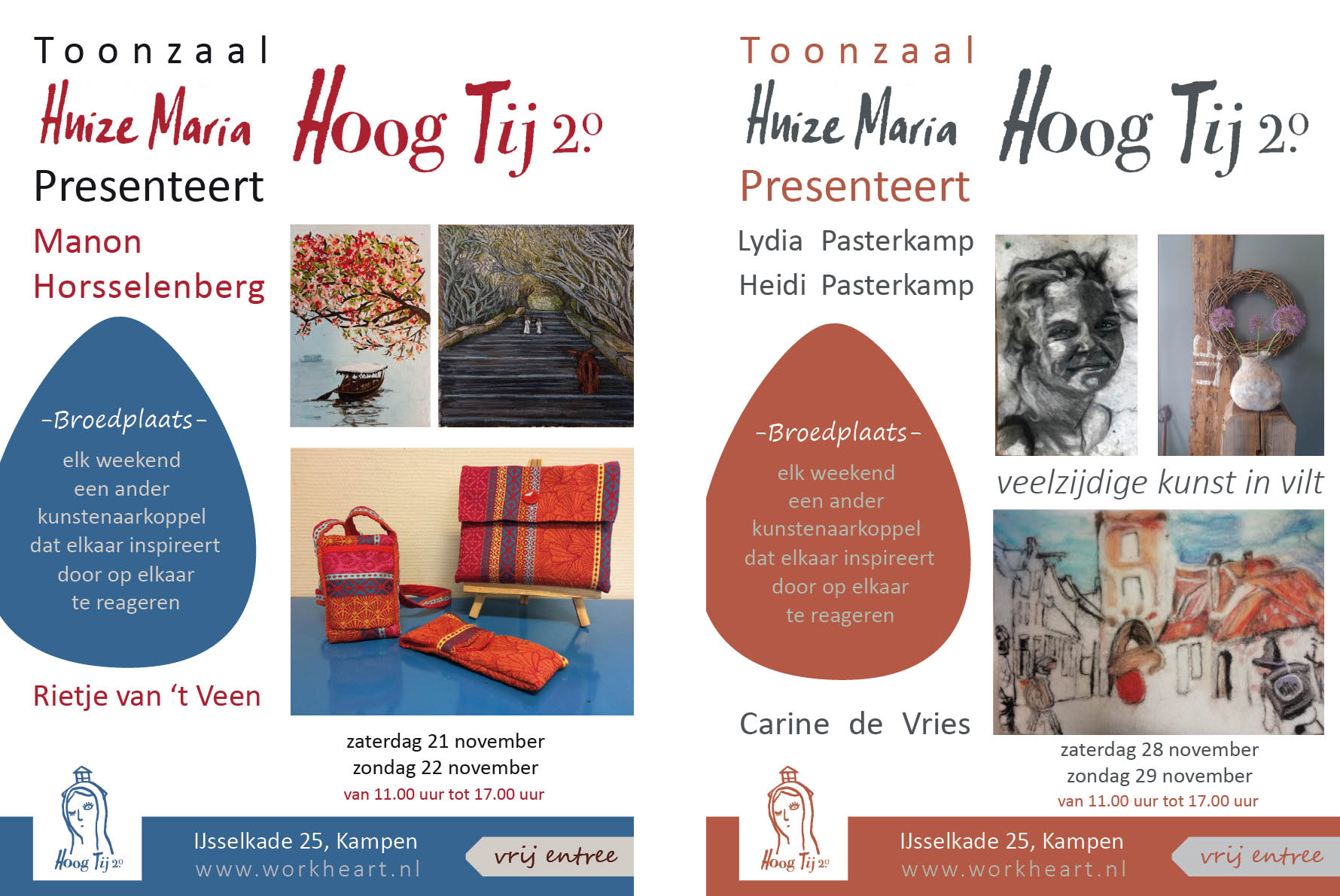 In verband met Covid 19 regels waarbij de musea twee weken dicht moesten, zijn de weekends van Irma & Marjan van Tilborg en van Stefan Cop & Timon Schellingerhout opgeschoven naar december resp. januari. In de tweede helft van november mocht Huize Maria weer open voor kunstenaars en publiek.