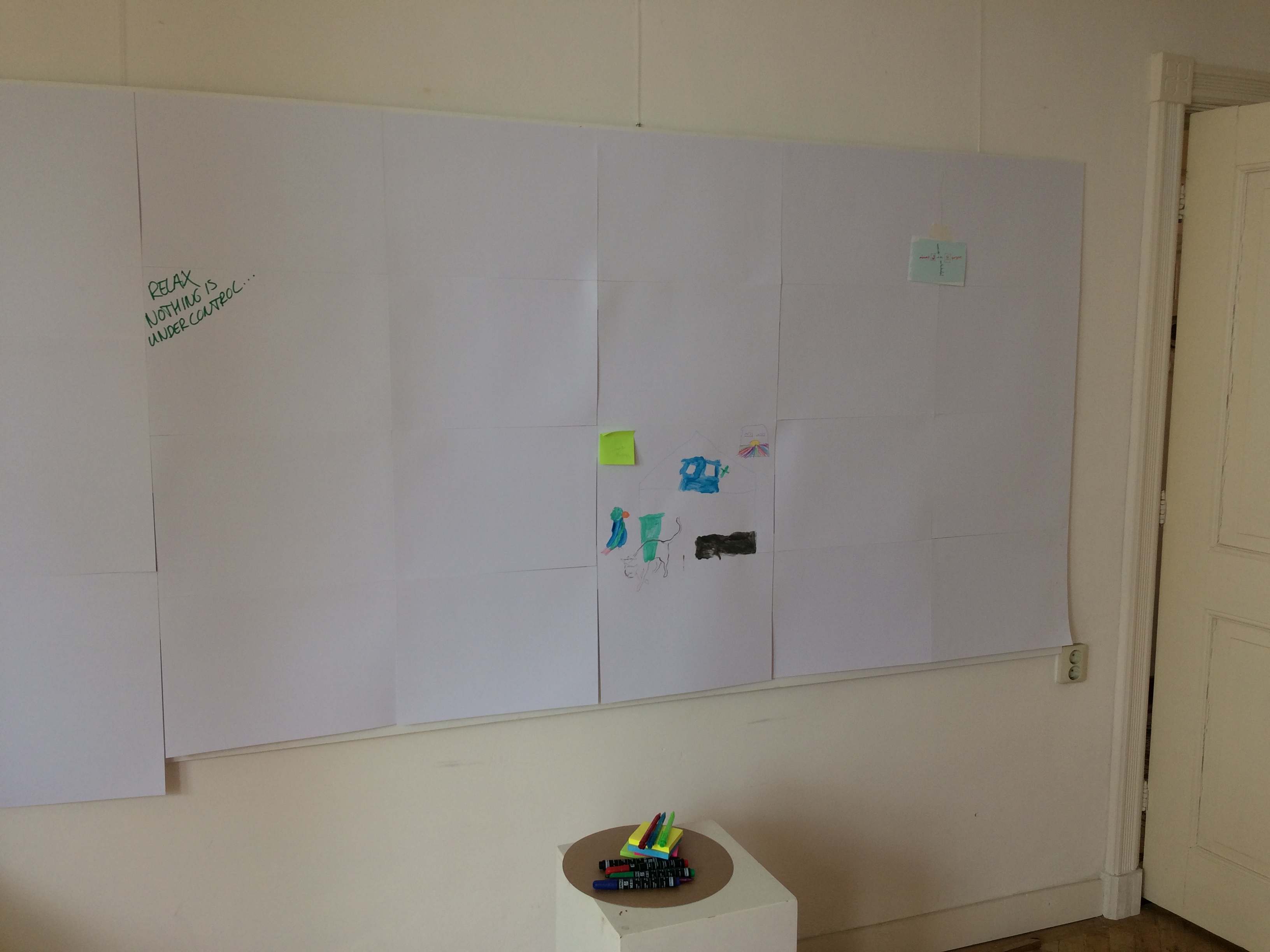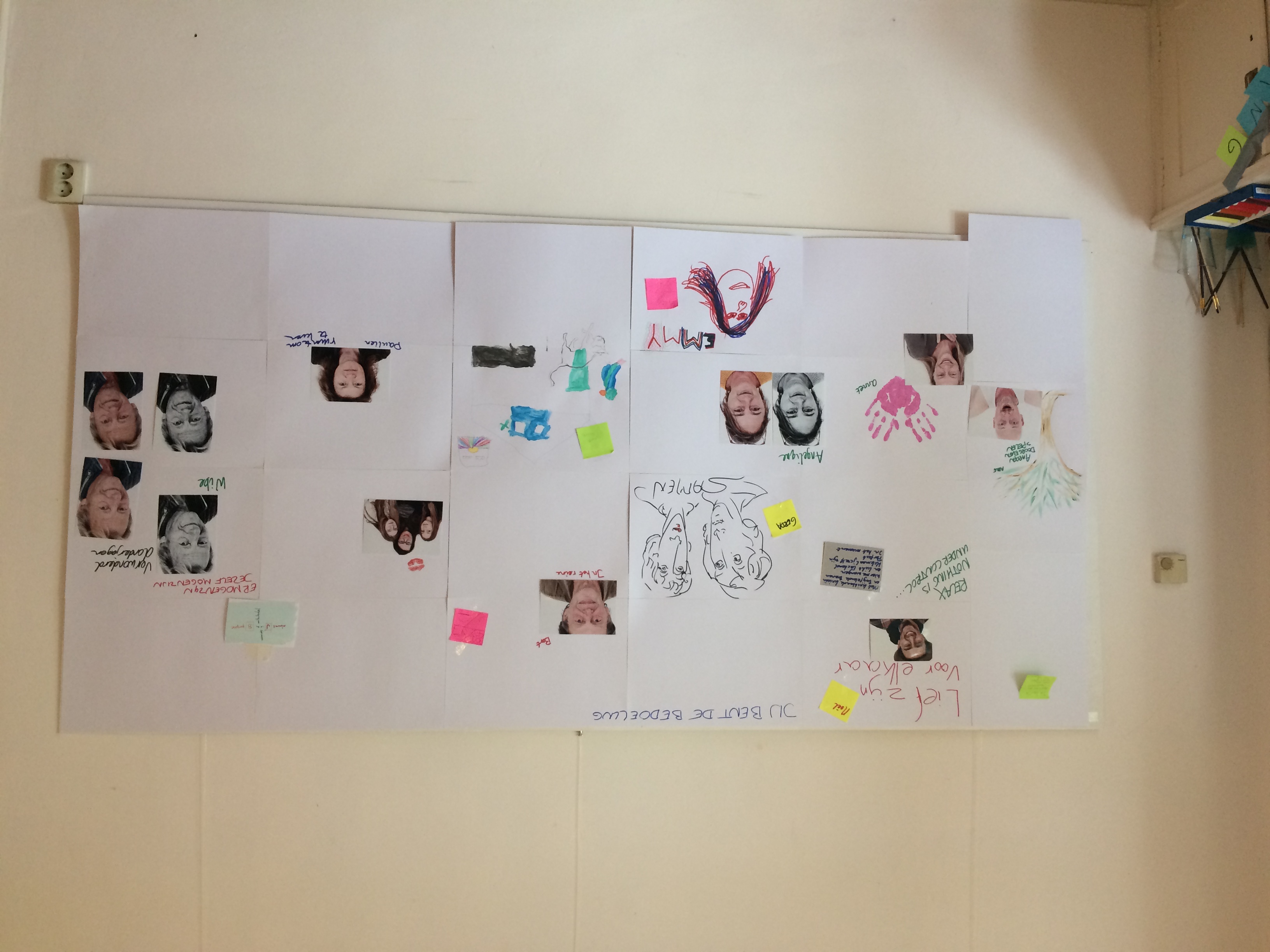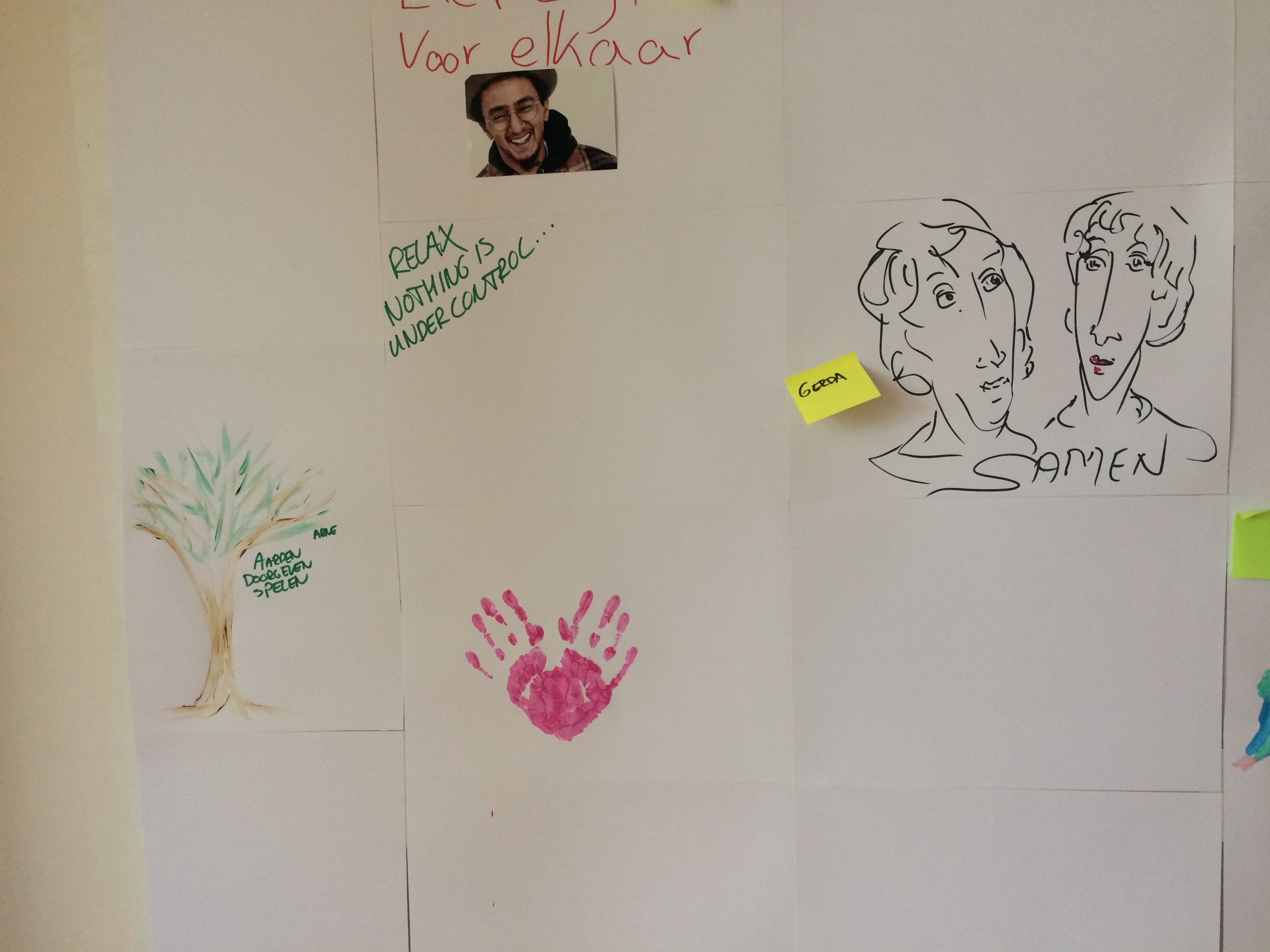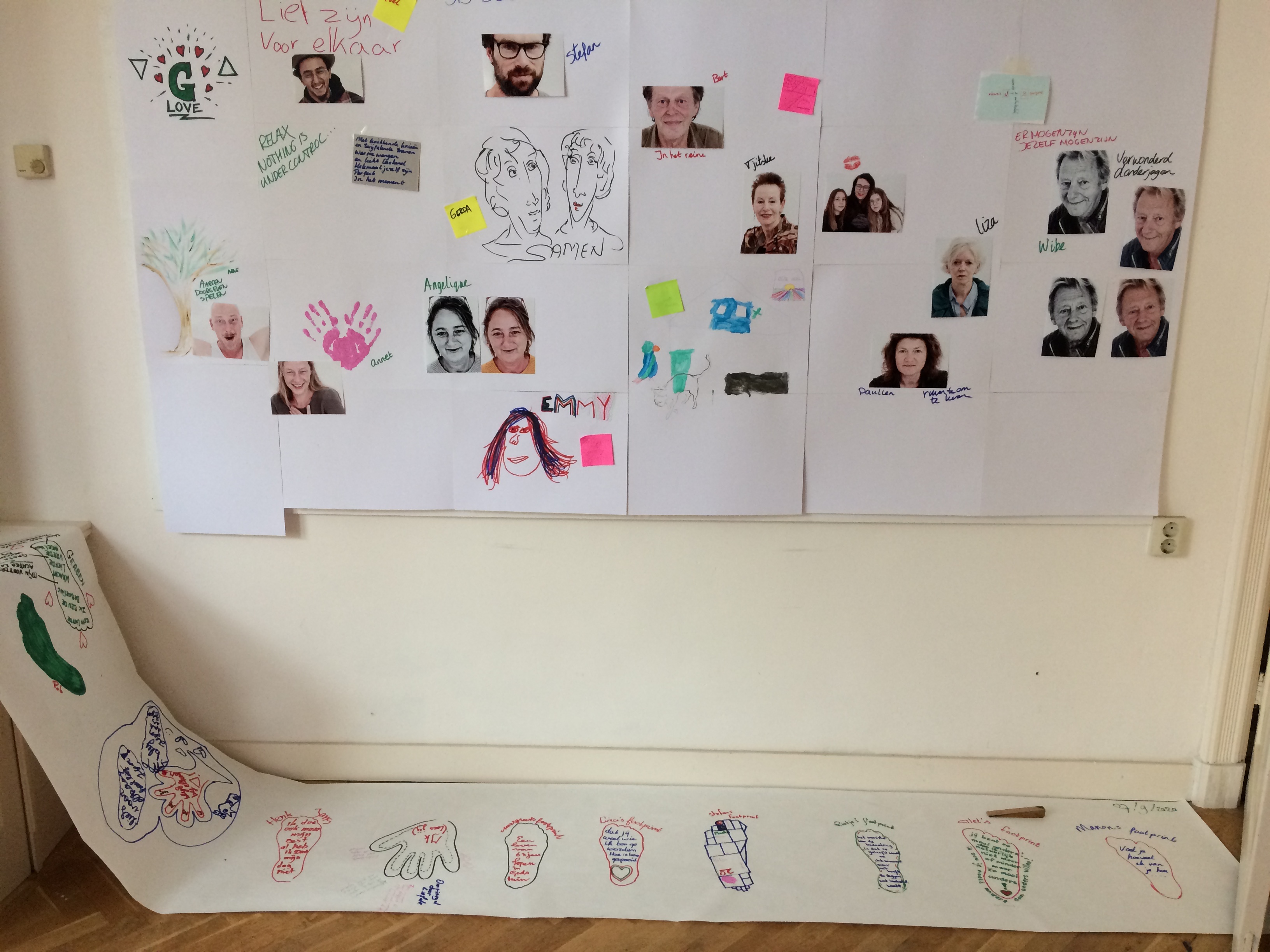 Het storyboard was aan het begin van de ochtend geheel leeg op een tekst van Manon na. Nu heeft het publiek haar bijdrage al getekend, geschilderd en gezoend. Ook een handafdruk met vingerverf is een heel persoonlijke toets. Vind je iets belangrijk of gewoon mooi? Zet er maar op en het doet mee in het verhaal dat Manon en Rob samenstellen onder het motto: ‘Jij bent de bedoeling’. Vind je het ook leuk om mee te doen? Kom langs in Huize Maria.