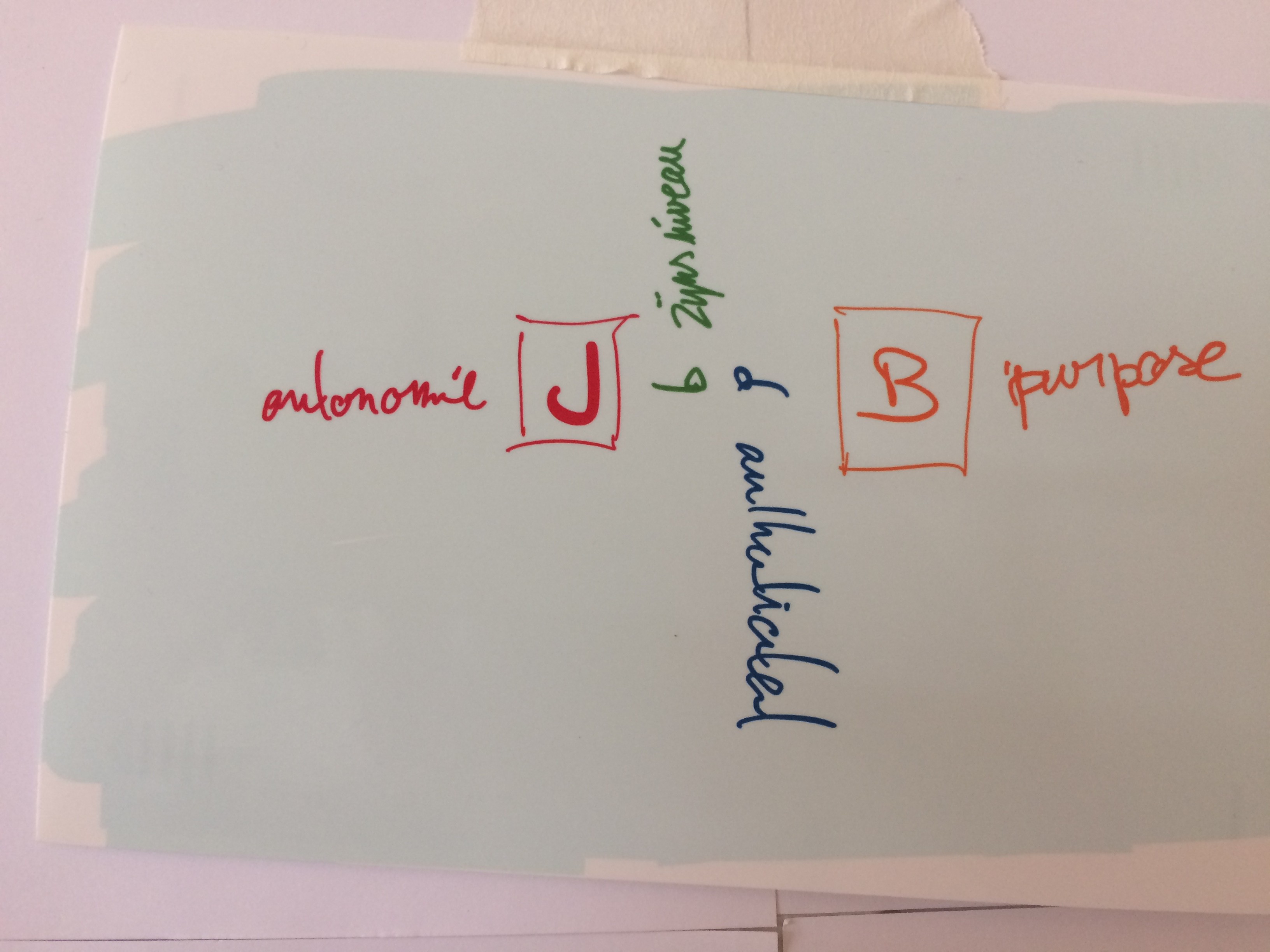 ‘Jij bent de bedoeling’ van Rob en Manon. Waar de éen het bij een geschreven tekstje op het storyboard hield, tekende de ander een footprint op een rol papier op de grond met daarin een tekst die achter mocht blijven na dit leven of juist nu de wereld ingestuurd mocht worden.