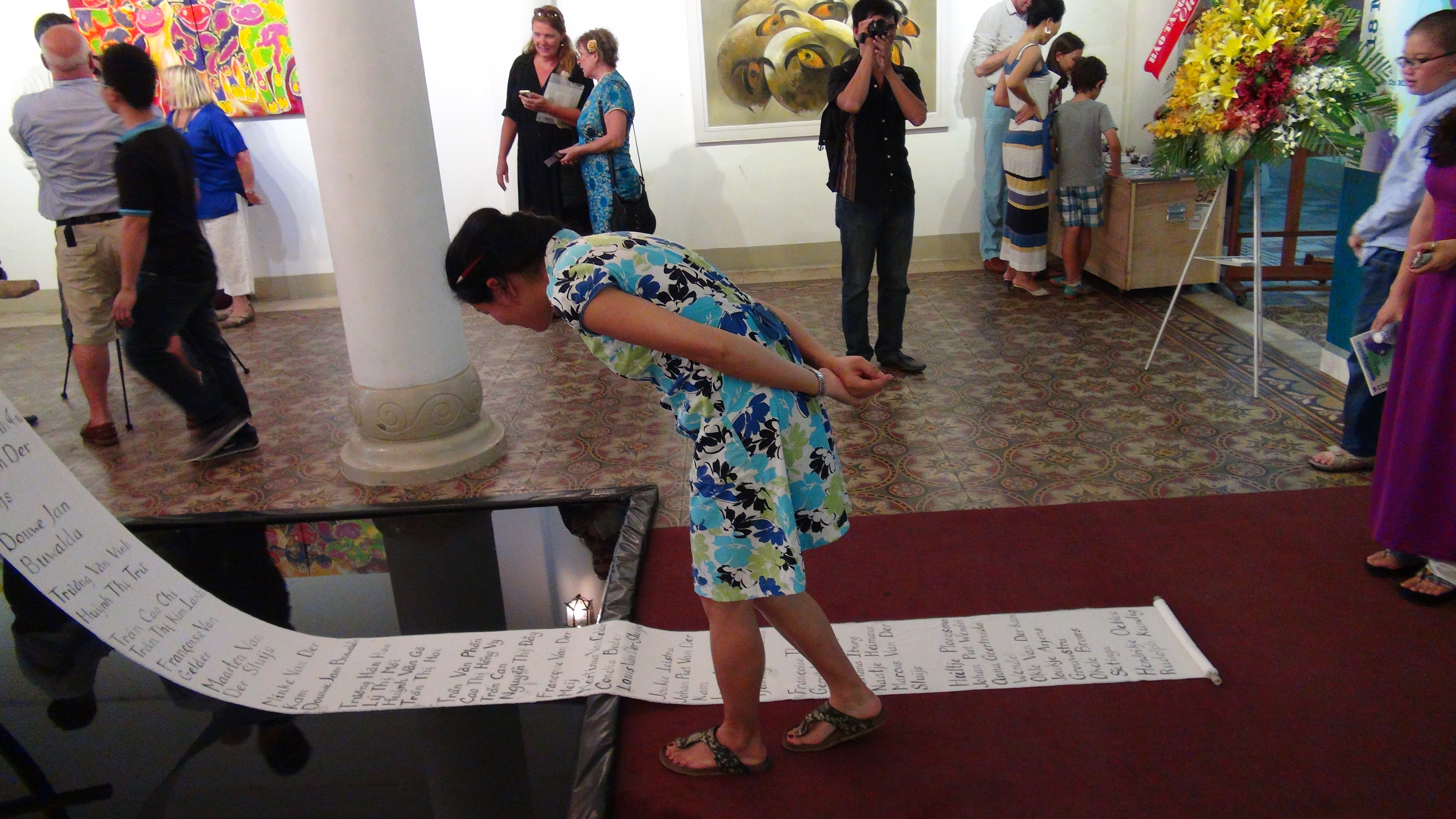 Van links naar rechts: Museum directrice Mã Thanh Cao met de Consul Generaal en zijn vrouw; met interesse worden de namen van de voorouders van ons vieren gelezen, die door Hăn en Tù op een banier geschilderd zijn; een stafmedewerker van het museum kondigt alle sprekers aan; publiek en kunstenaars kijken en genieten samen van de expositie..