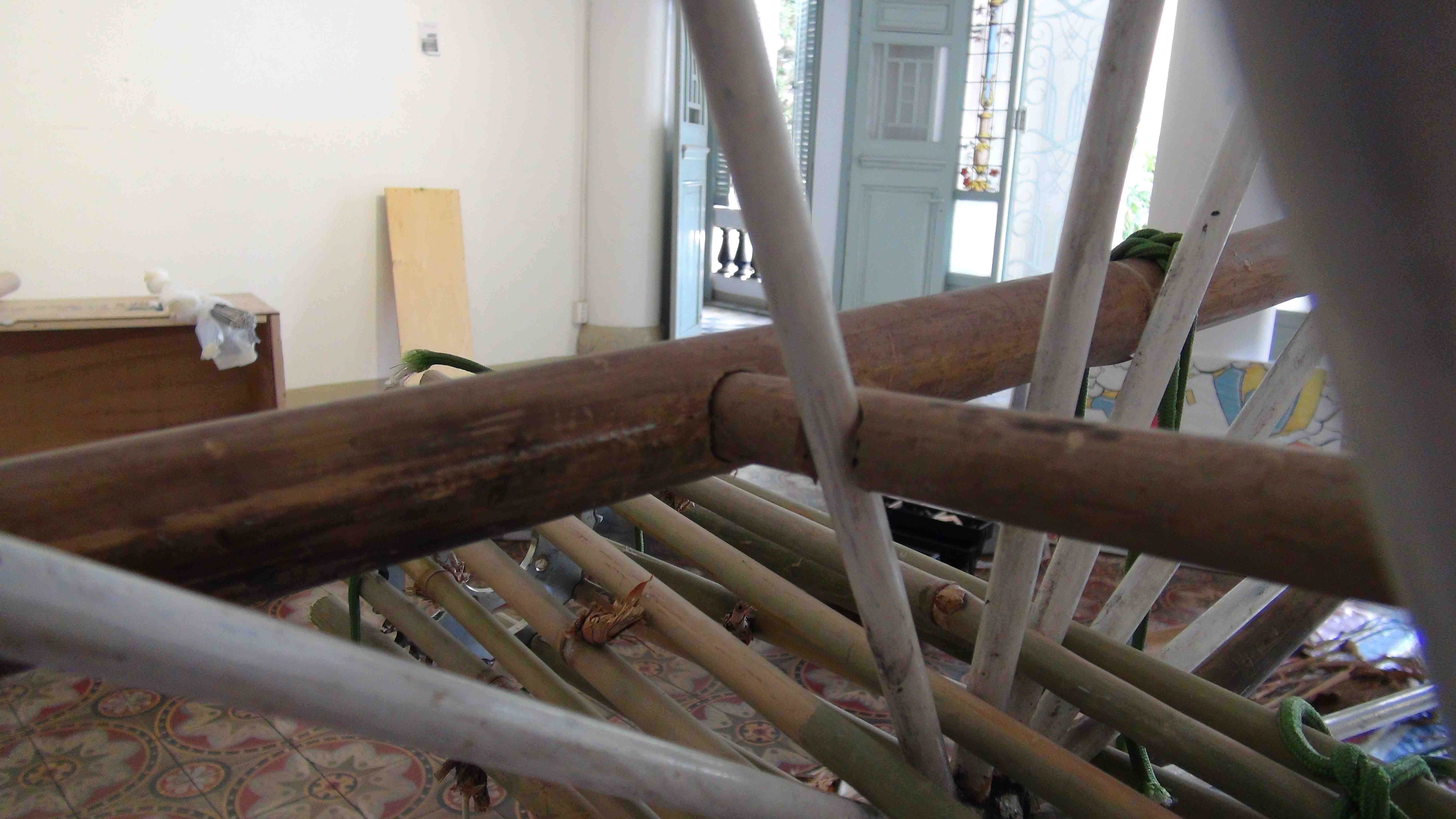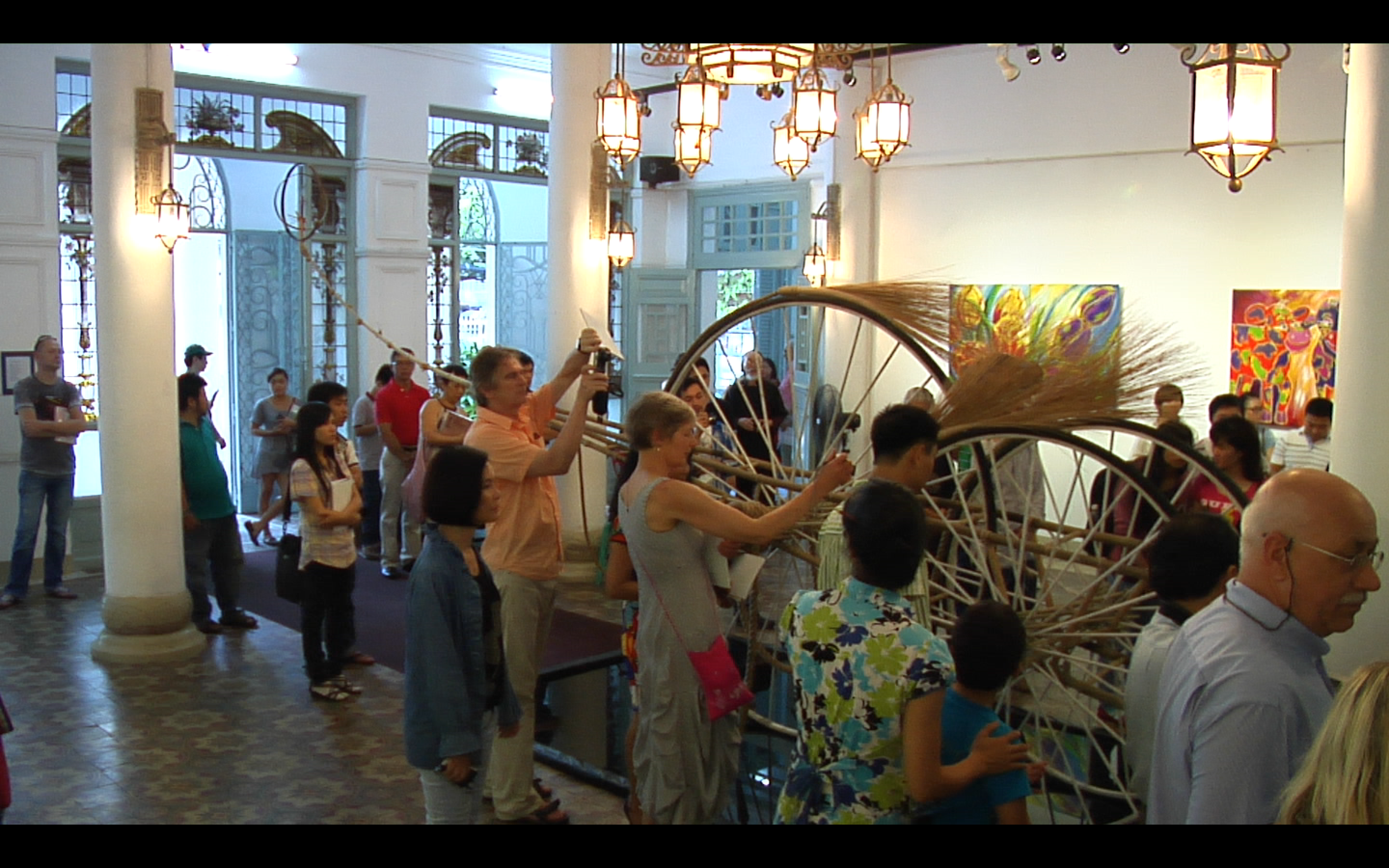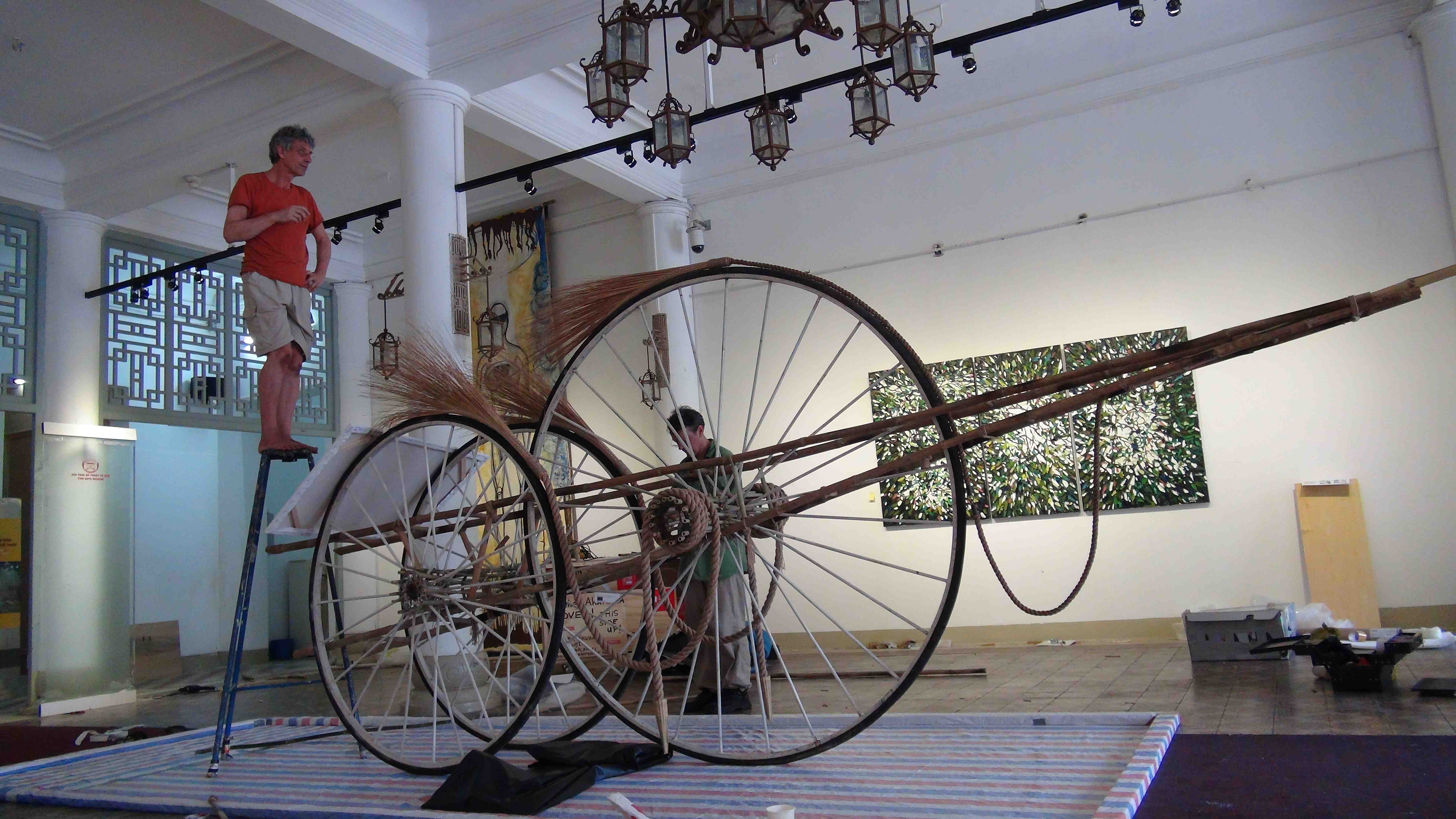 Ons werk is ter plekke ontwikkeld als een samenwerkingsproject dat twee culturen vertegenwoordigt. We hebben met twee Vietnamese kunstenaars gewerkt en met materiaal dat natuurlijk voorradig is hier.