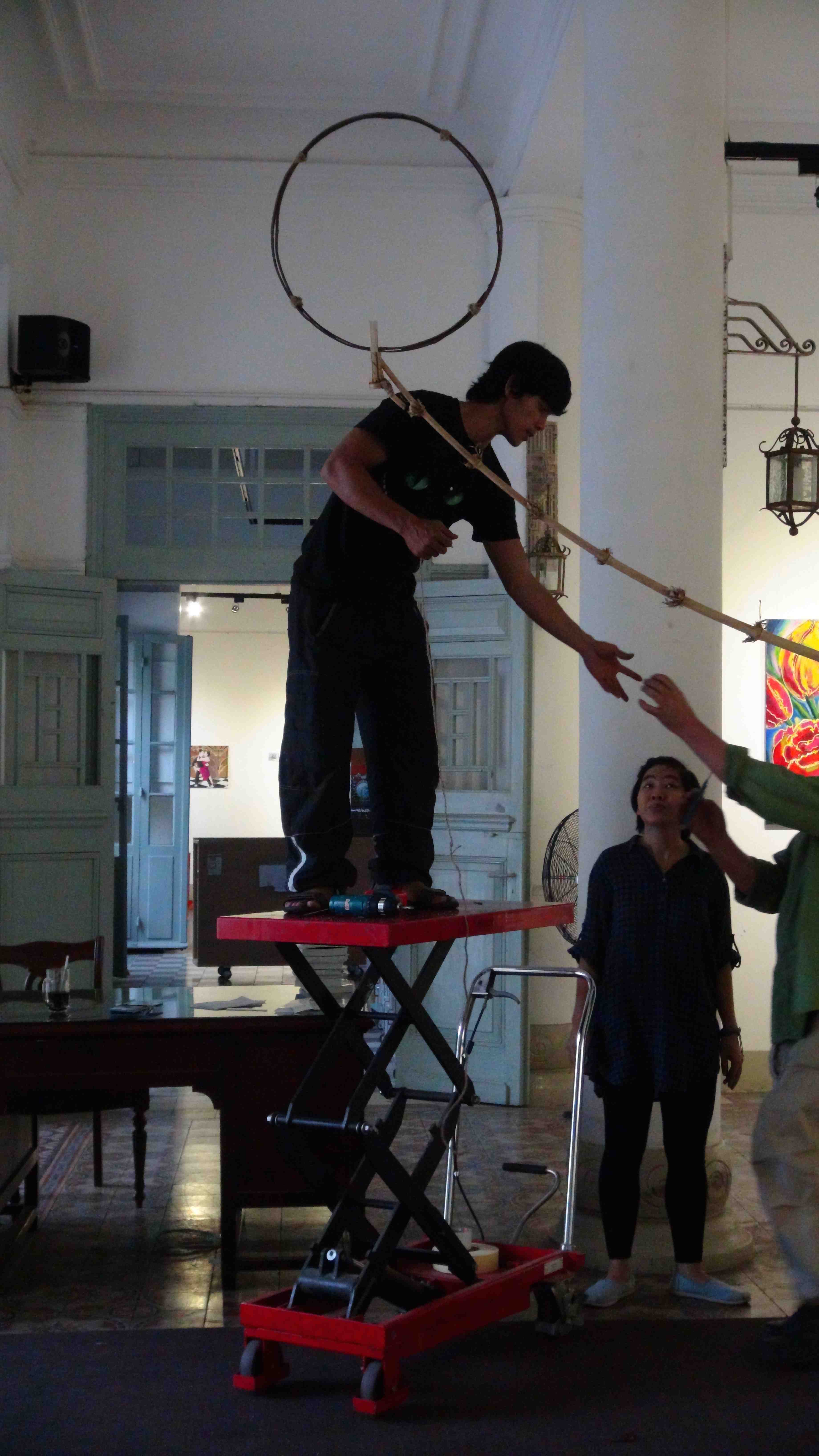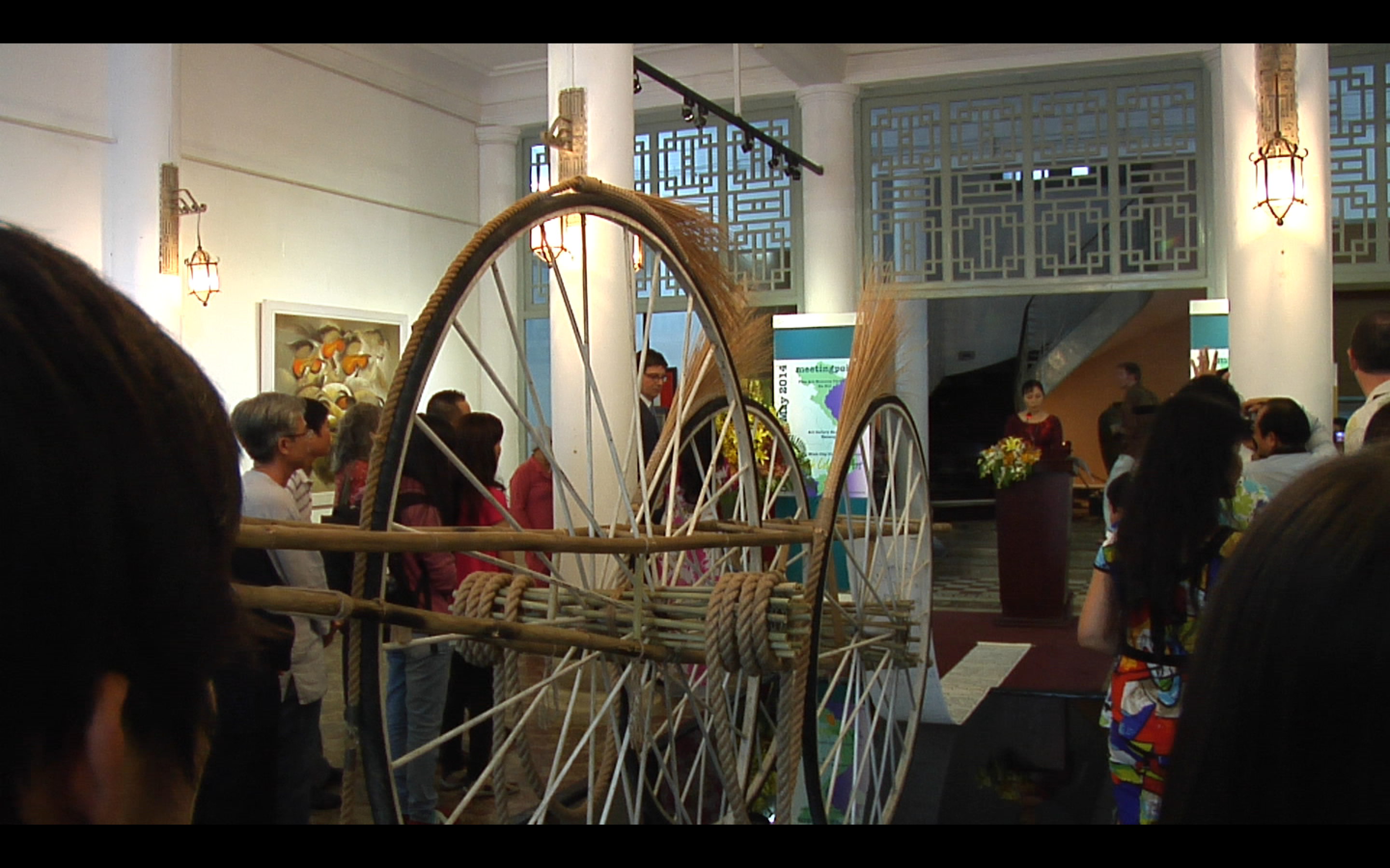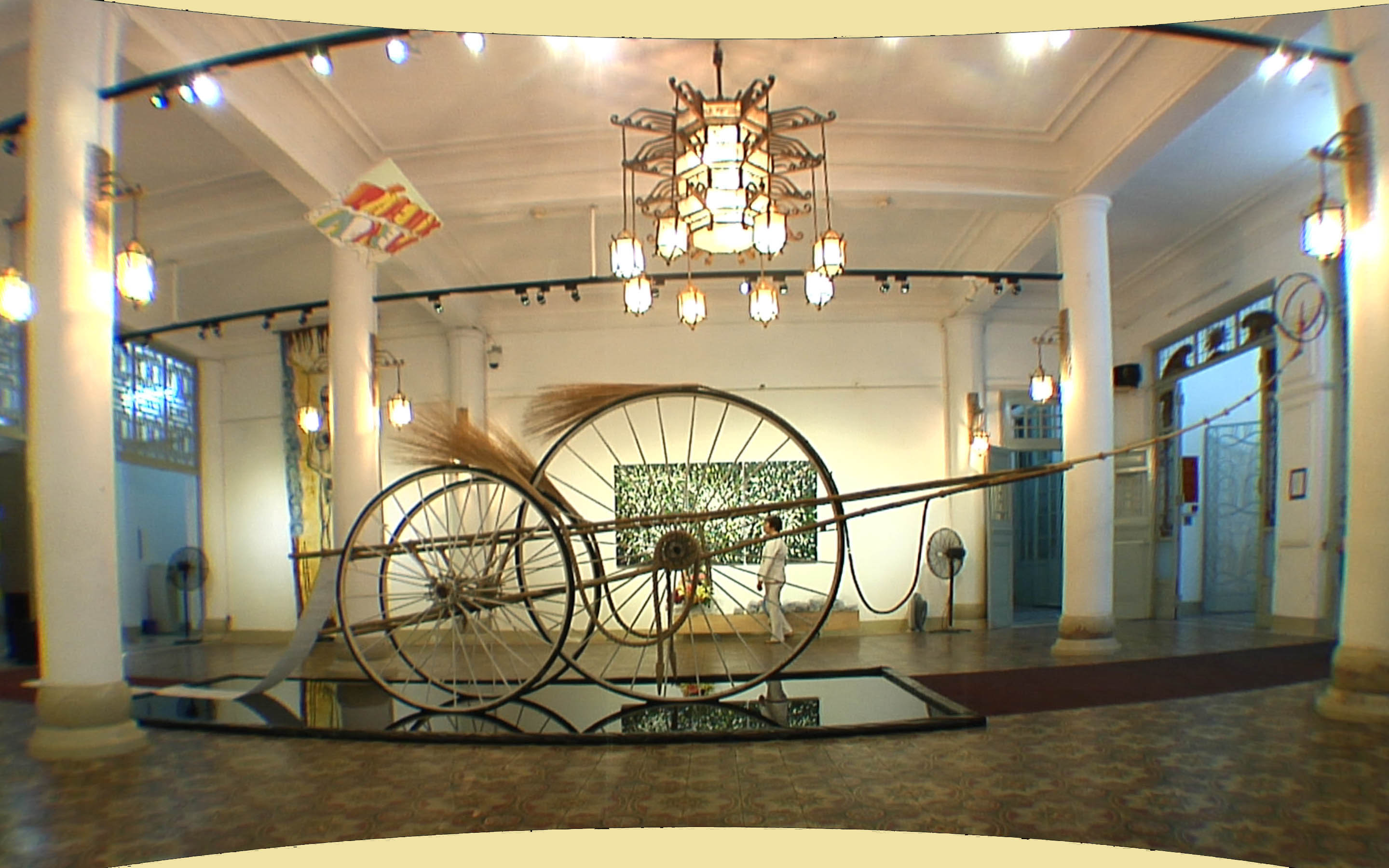 Ons werk is ter plekke ontwikkeld als een samenwerkingsproject dat twee culturen vertegenwoordigt. We hebben met twee Vietnamese kunstenaars gewerkt en met materiaal dat natuurlijk voorradig is hier.