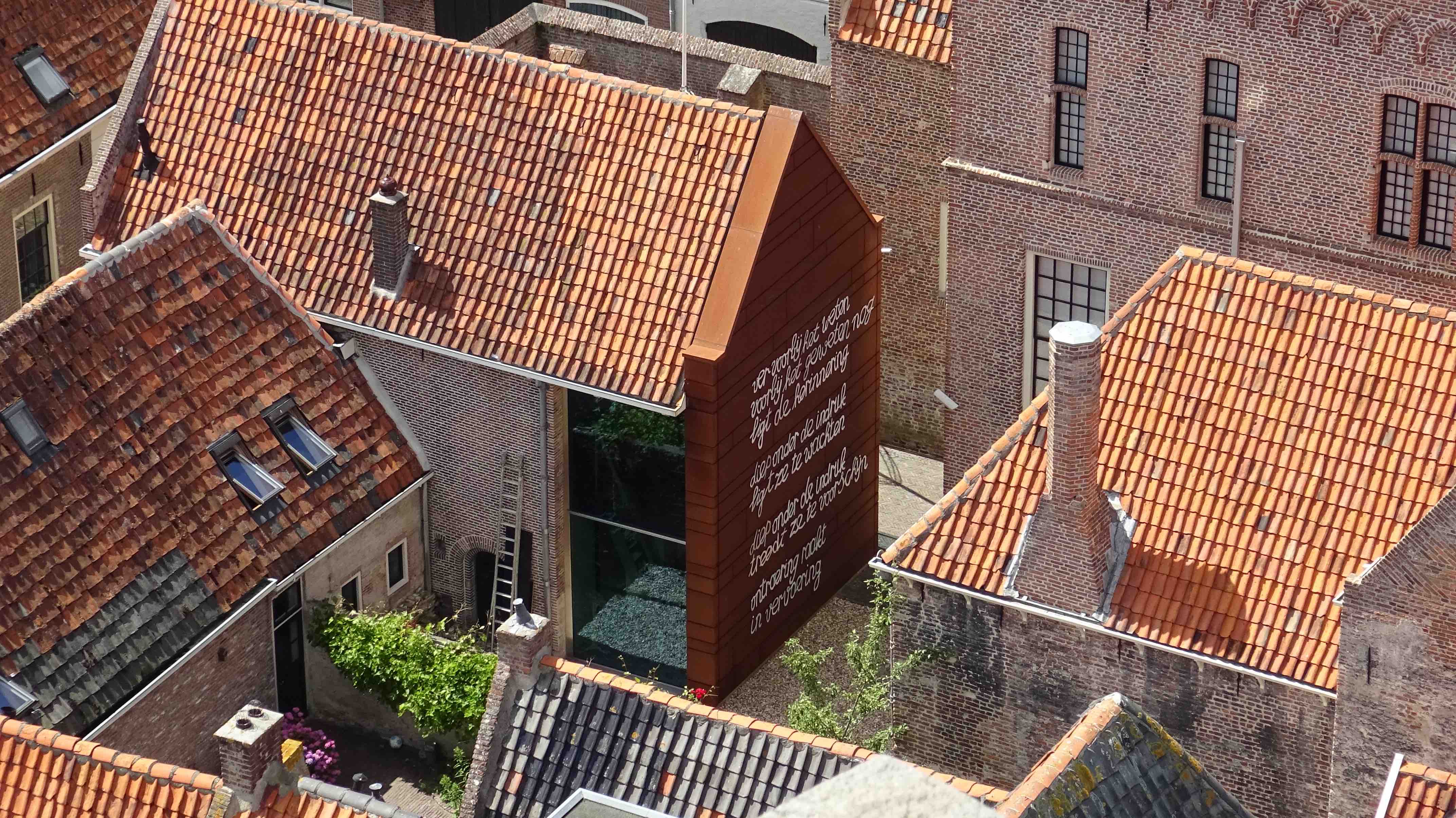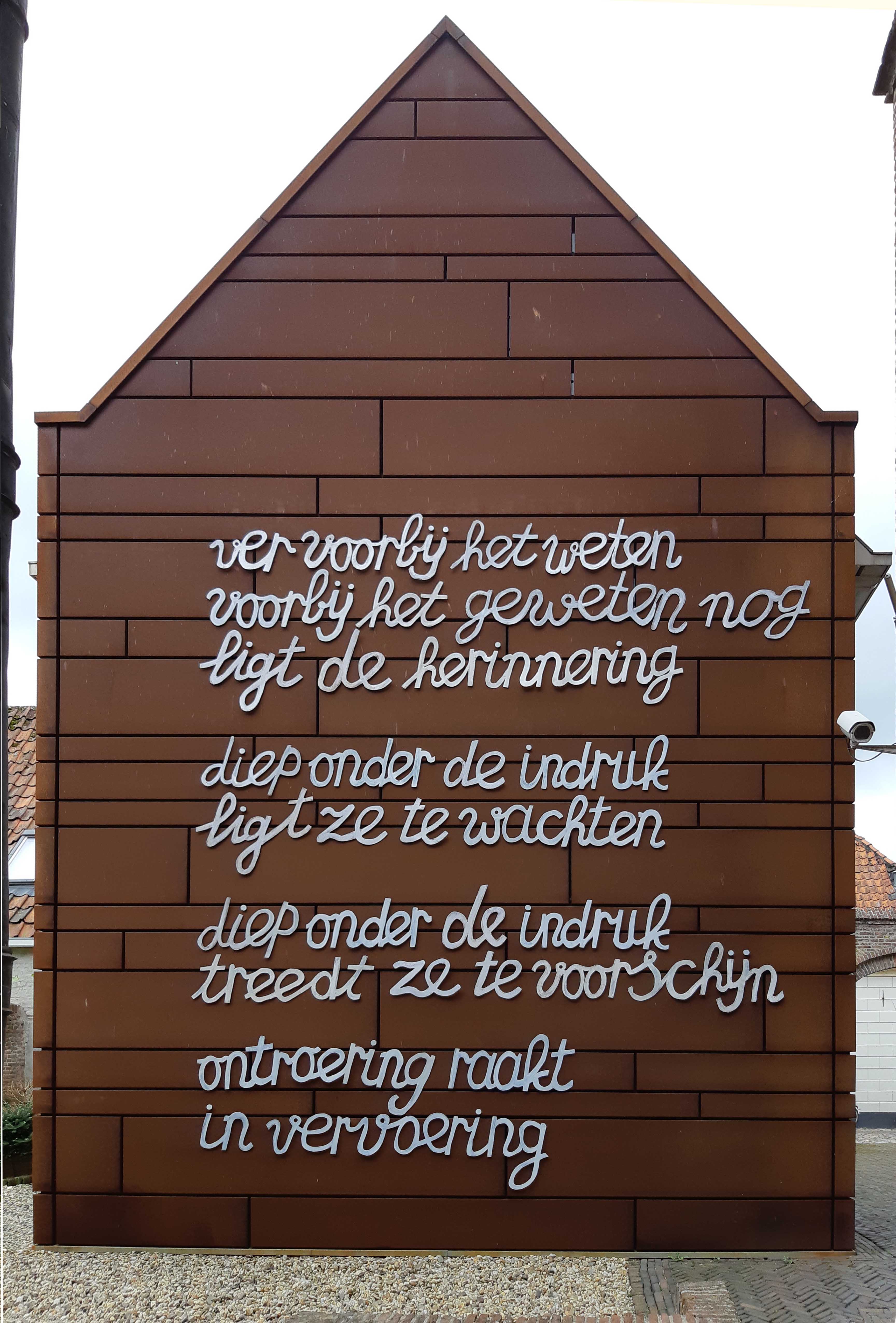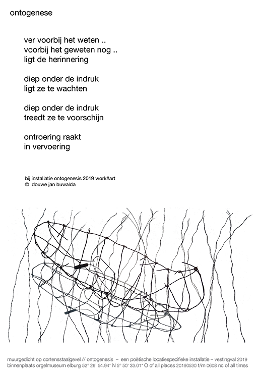 Bij deze installatie hoort het gedicht dat, pas om de hoek direct zichtbaar op de Corten-staal wand van een bijgebouw van het Nationaal Orgel Museum, tijdelijk is aangebracht. Deze wand is weer als kunstwerk toegevoegd, ontworpen door de architect die verantwoordelijk is voor de verbouwing van het gehele complex.