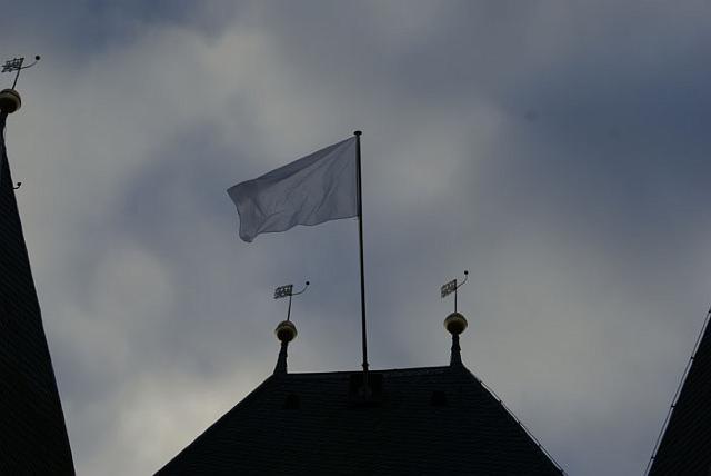 Aan haar kade een poort in een muur met een, fier uit het dak omhoog gestoken uitgesproken witte vlag.
