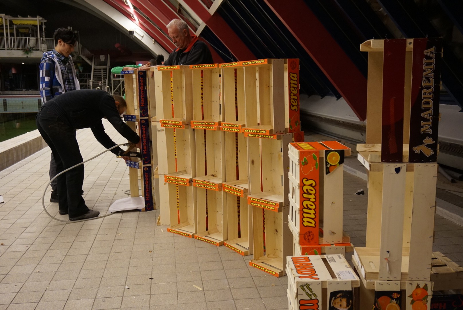 Houtbewerking: slopen, zagen, timmeren, schroeven. (we gaan voornamelijk licht pellet-hout verwerken, maar ook triplex en wat zwaarder multiplex en lange latten)