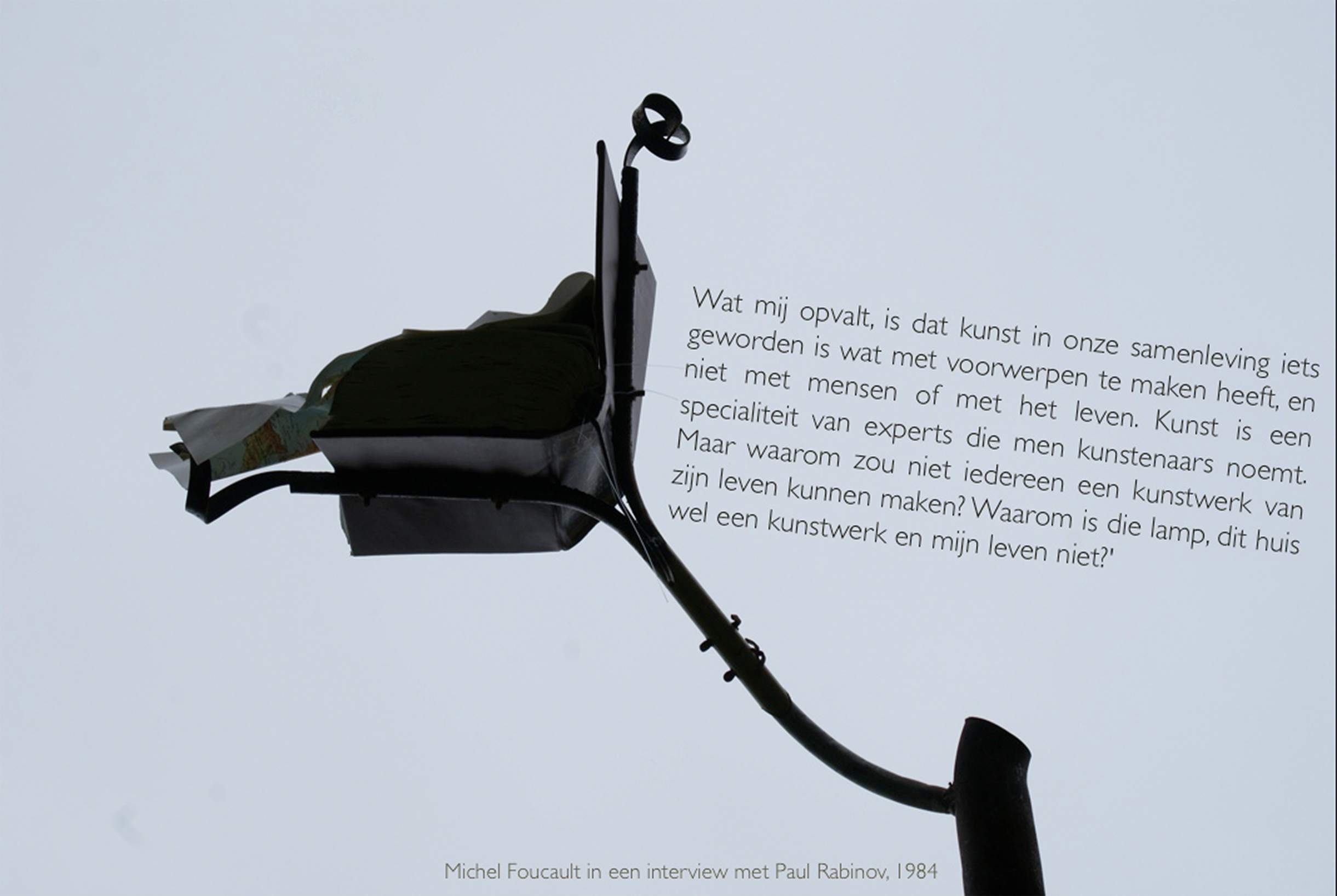 ‘Wat mij opvalt, is dat kunst in onze samenleving iets geworden is wat met voorwerpen te maken heeft, en niet met mensen of met het leven. Kunst is een specialiteit van experts die men kunstenaars noemt. Maar waarom zou niet iedereen een kunstwerk van zijn leven kunnen maken? Waarom is die lamp, dit huis wel een kunstwerk en mijn leven niet?’ Michel Foucault (1926 – 1984), in een interview met Paul Rabinov, 1984